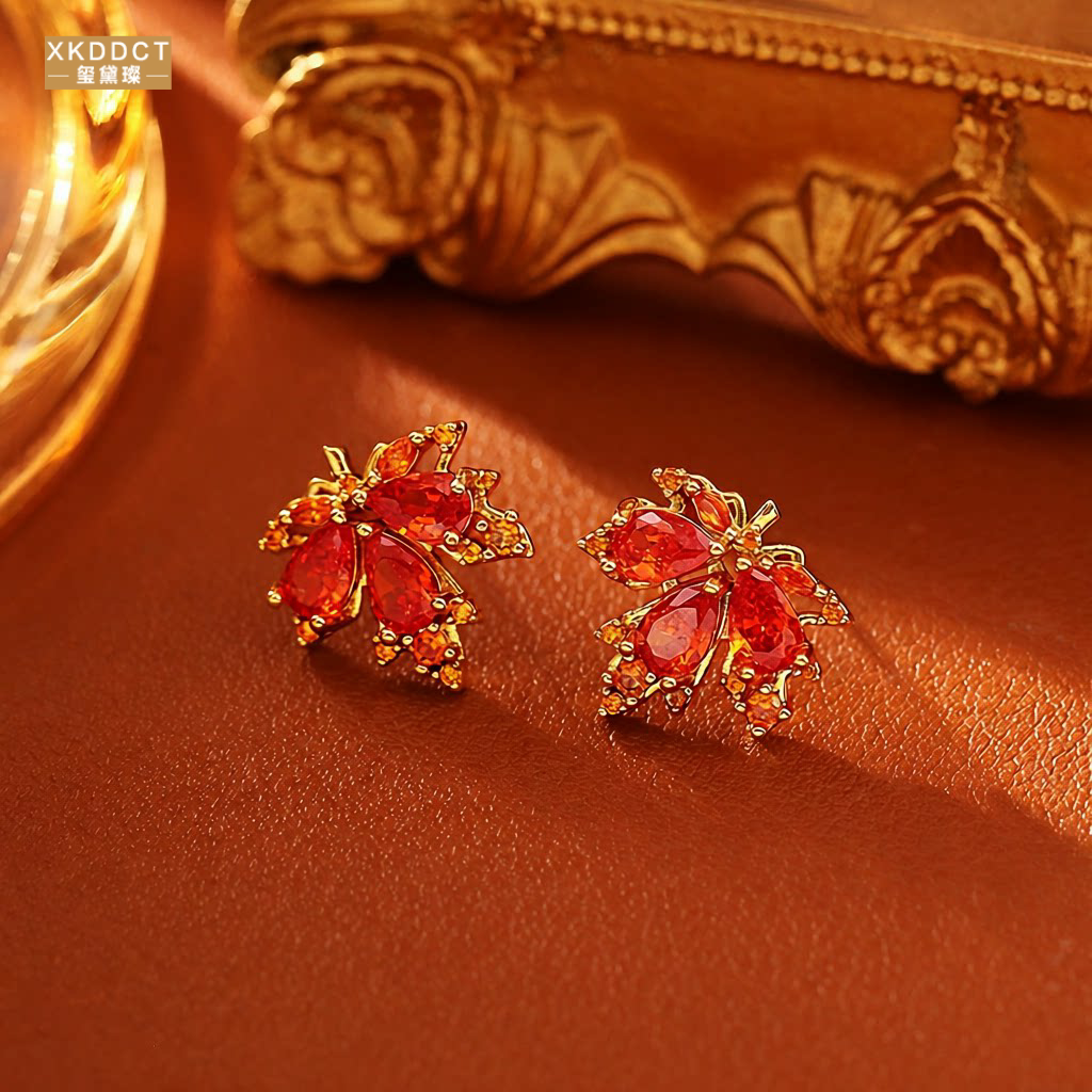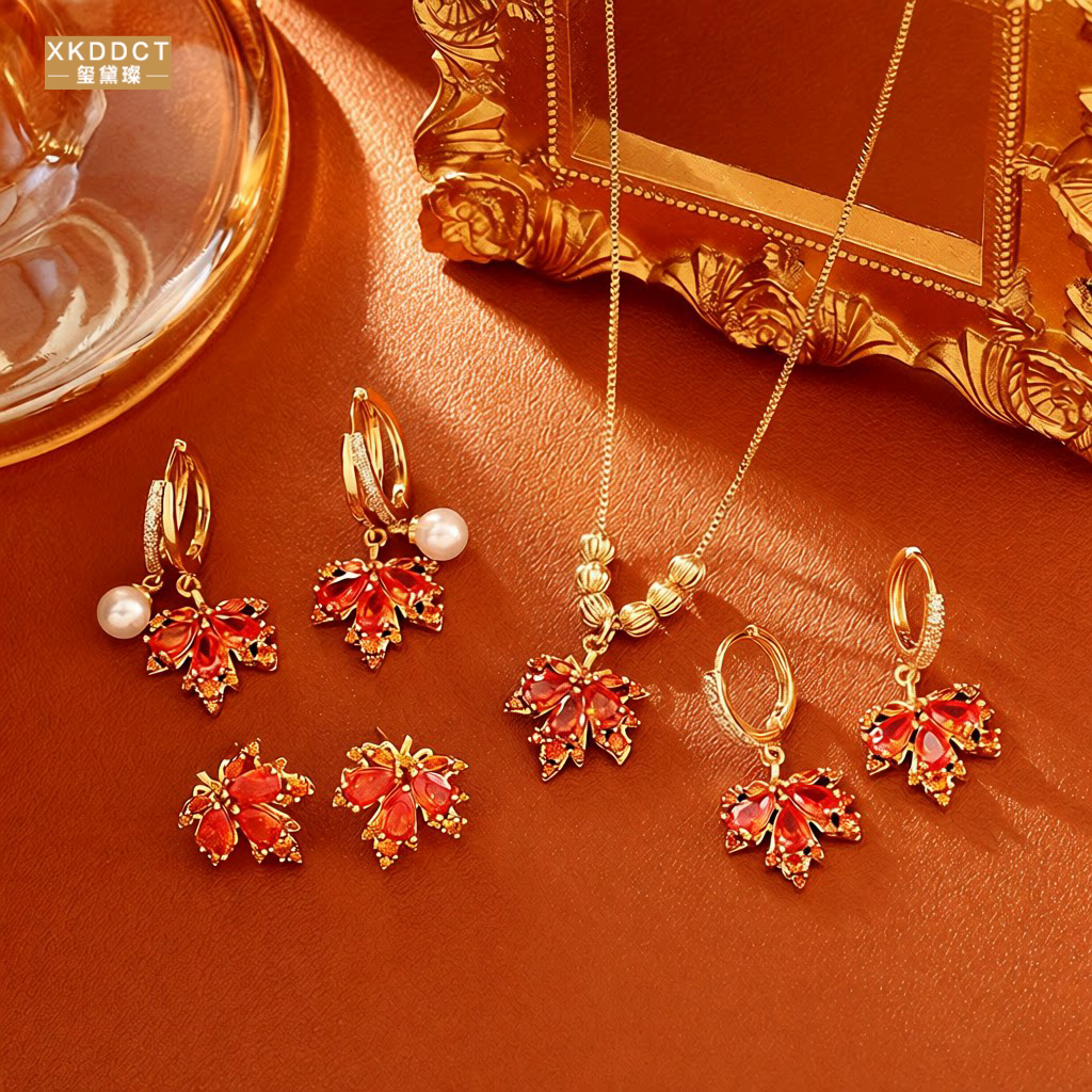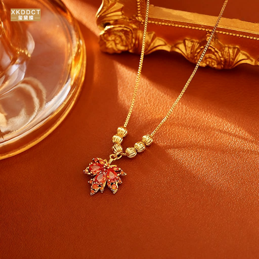 XKDDCT爆款红色枫叶锆石项链高级感精致优雅气质骨链仙女风耳饰潮