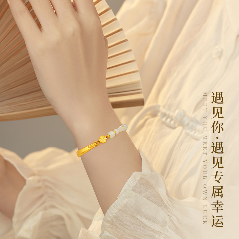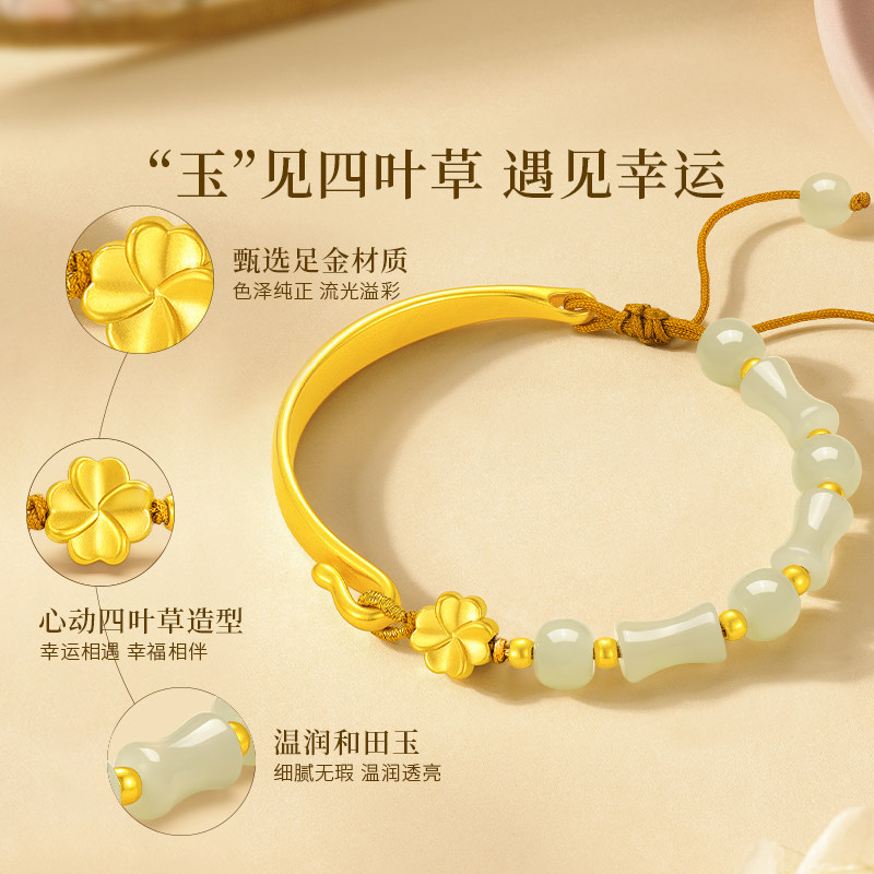 中国黄金央创四叶草手镯女足金手链女款和田玉手串圣诞节礼物女生