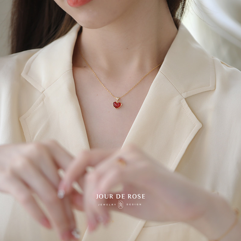 《甜心》小红心爱心简约复古个性纯银红色玛瑙纯银锁骨项链女