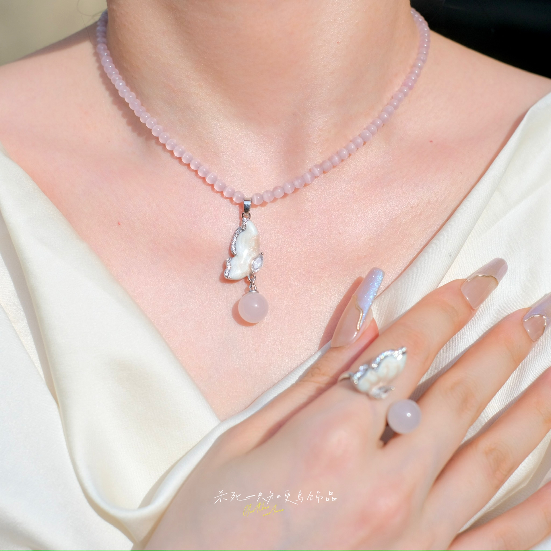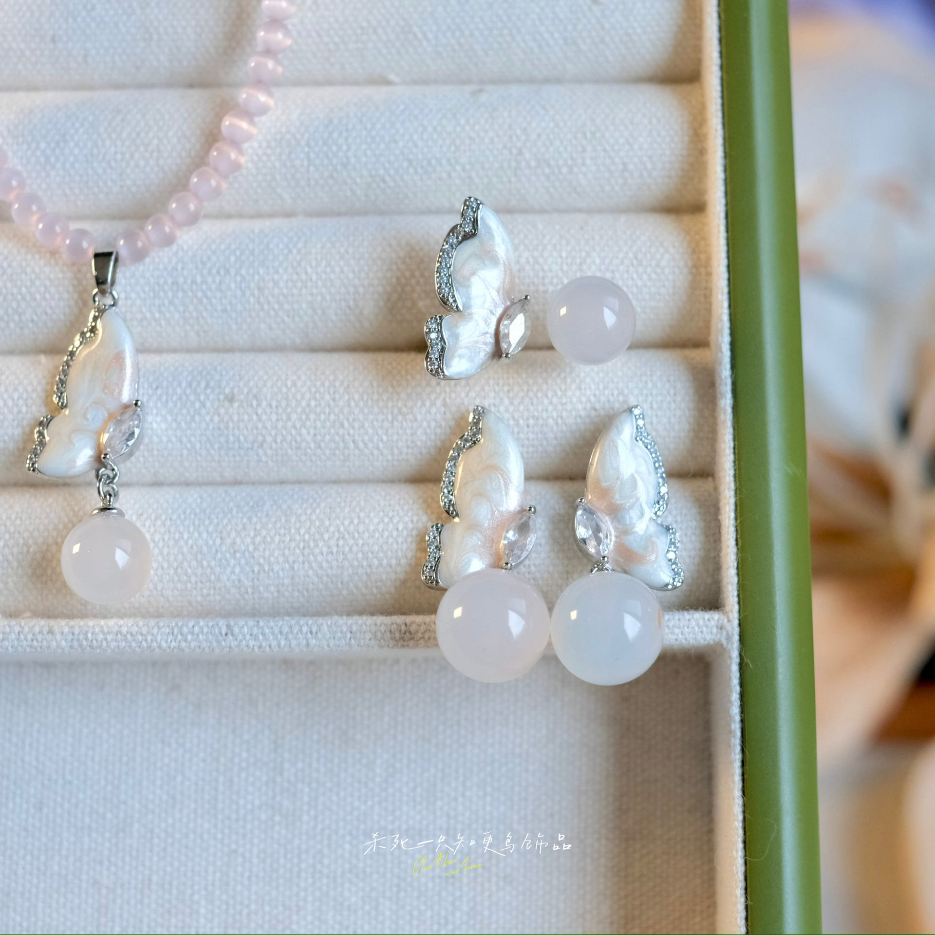 《玉堂春》原创复古新中式珐琅蝴蝶白玉髓项链耳环耳饰戒指套装女
