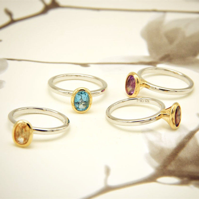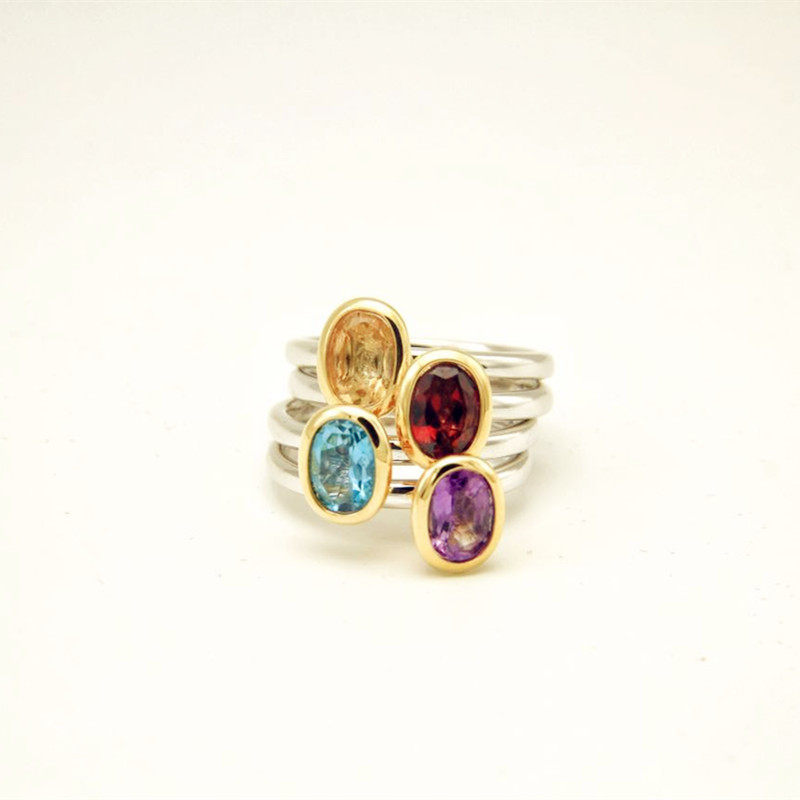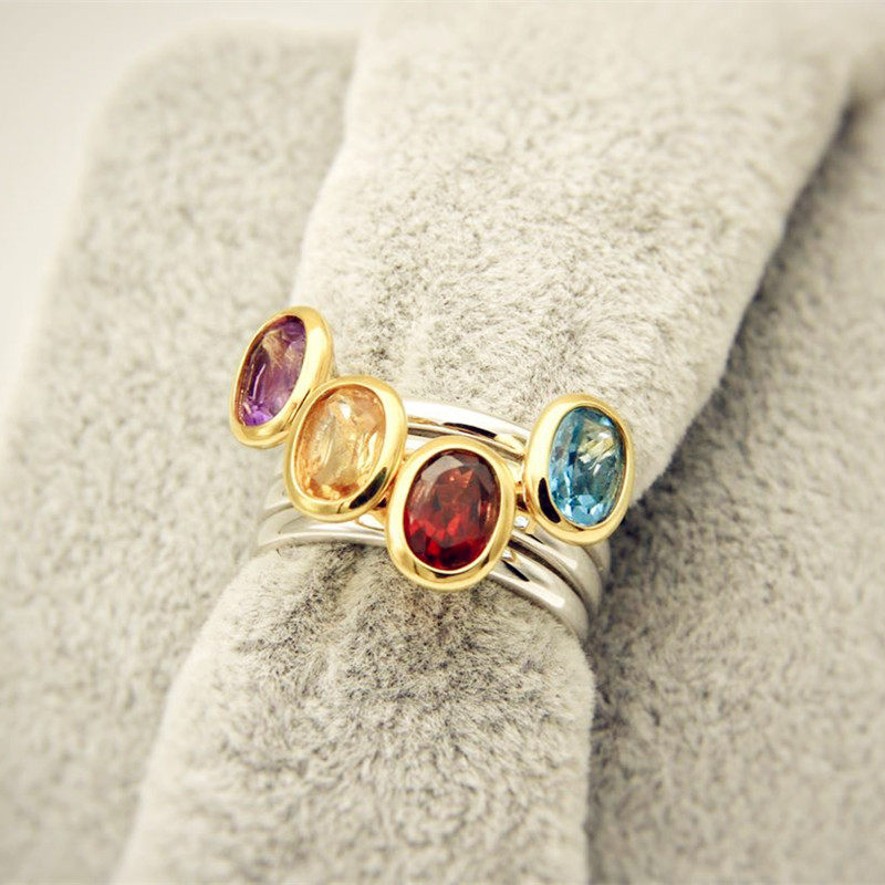 闺蜜屋北欧戒指天然石榴黄紫水晶瑞士蓝托帕椭圆纯银叠戴全新款