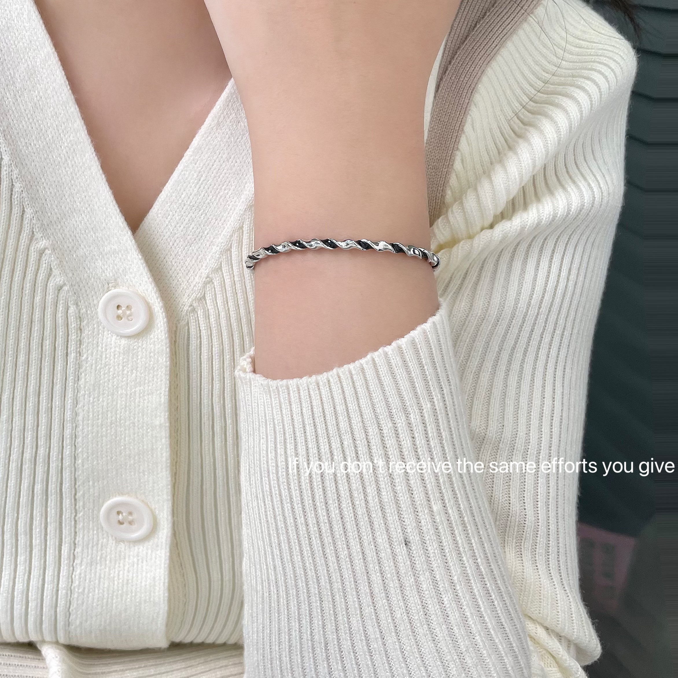 S925纯银黑色拼接麻花扭曲开口手镯时尚手环小众高级感百搭款