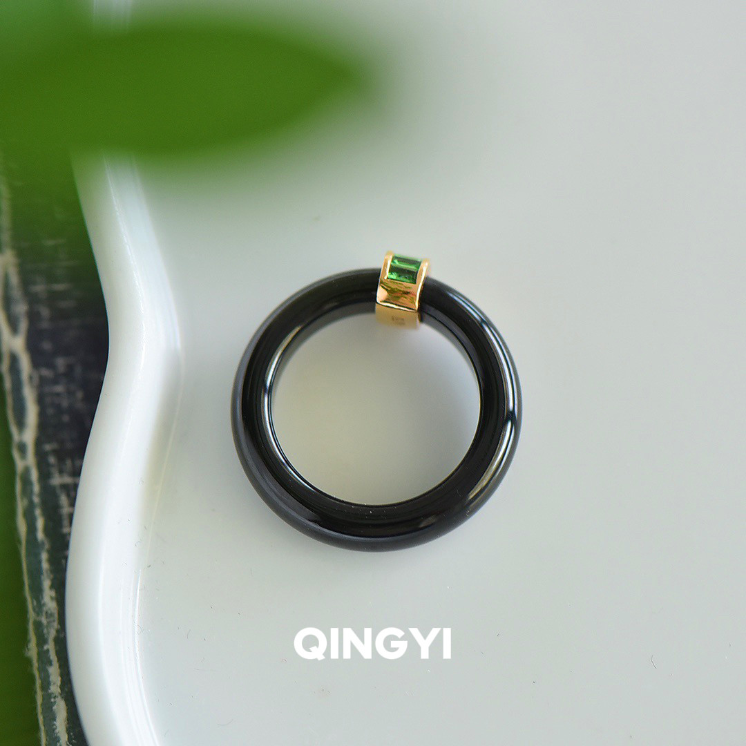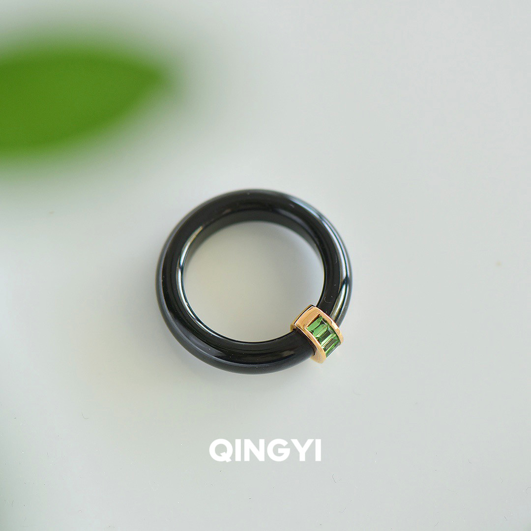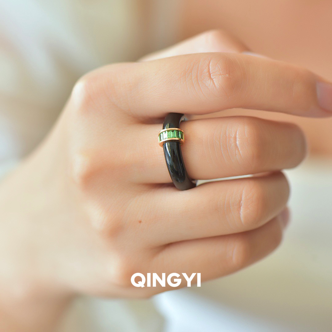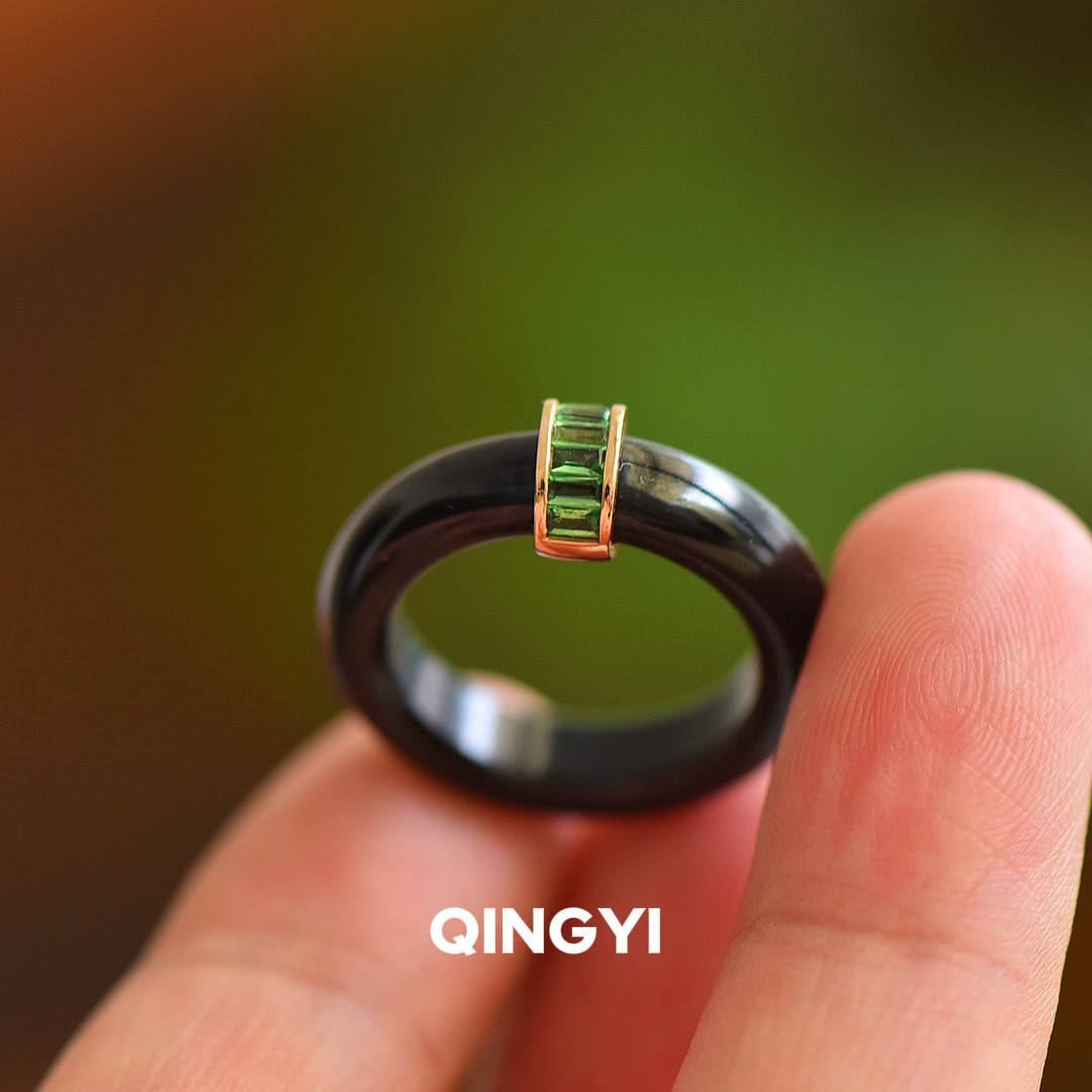 天然新疆和田玉墨玉戒指18k金镶绿碧玺女款玉石指环送朋友礼物