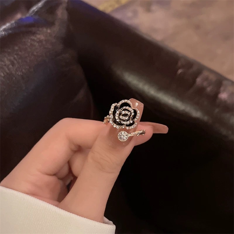人间富贵花~黑色山茶花戒指女ins高级感轻奢法式小香风温柔气质潮
