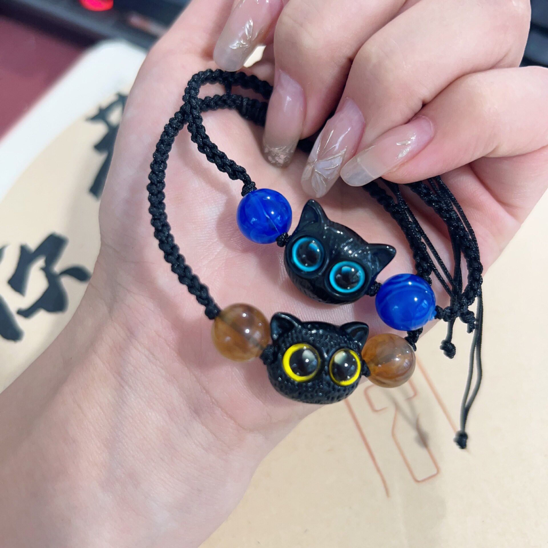 甜酷小喵ins小众设计黑色檀木小猫咪编织手链情侣送闺蜜礼物怪兽