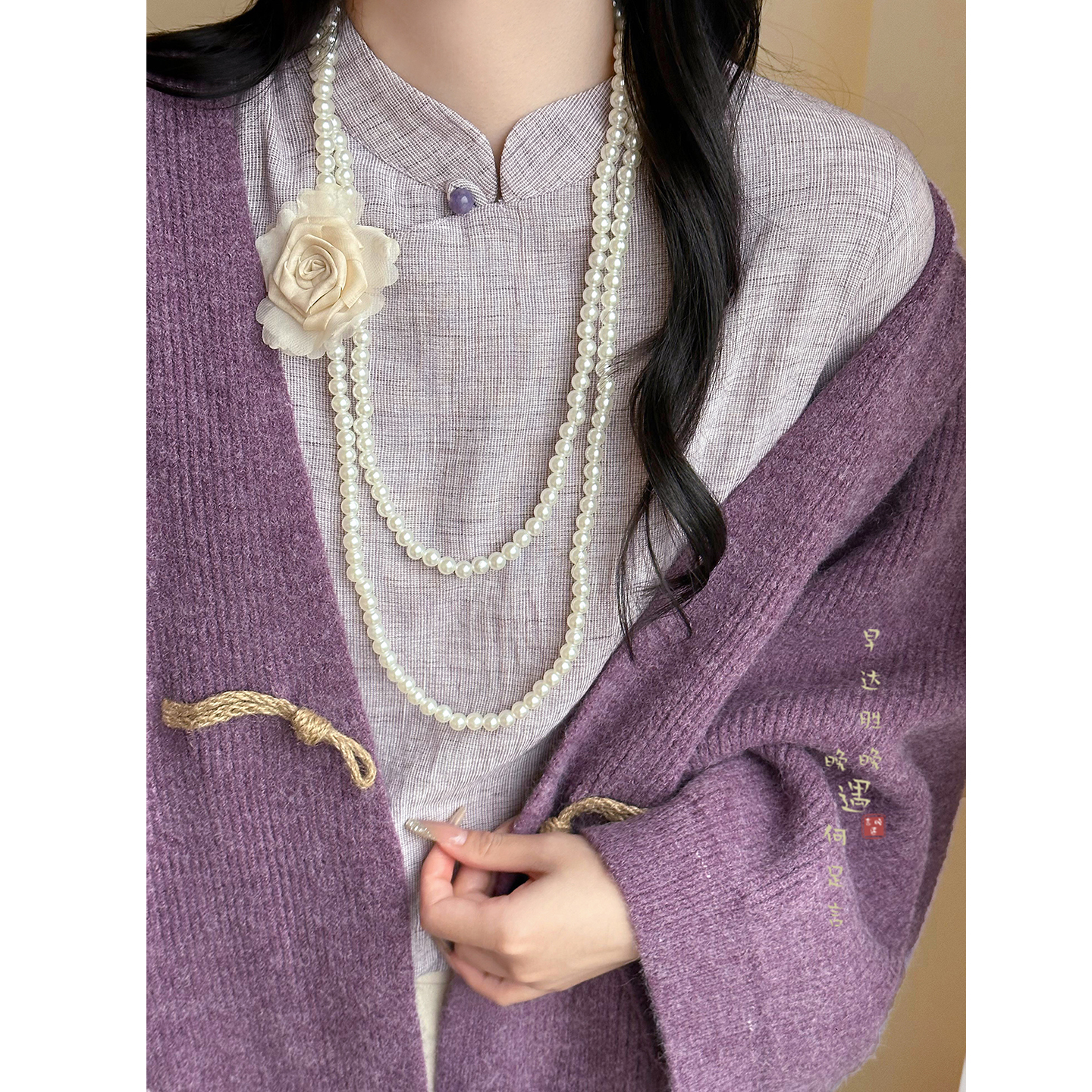 柏林花事~紫色玫瑰珍珠项链女高级感轻奢小众秋冬叠戴毛衣链配饰