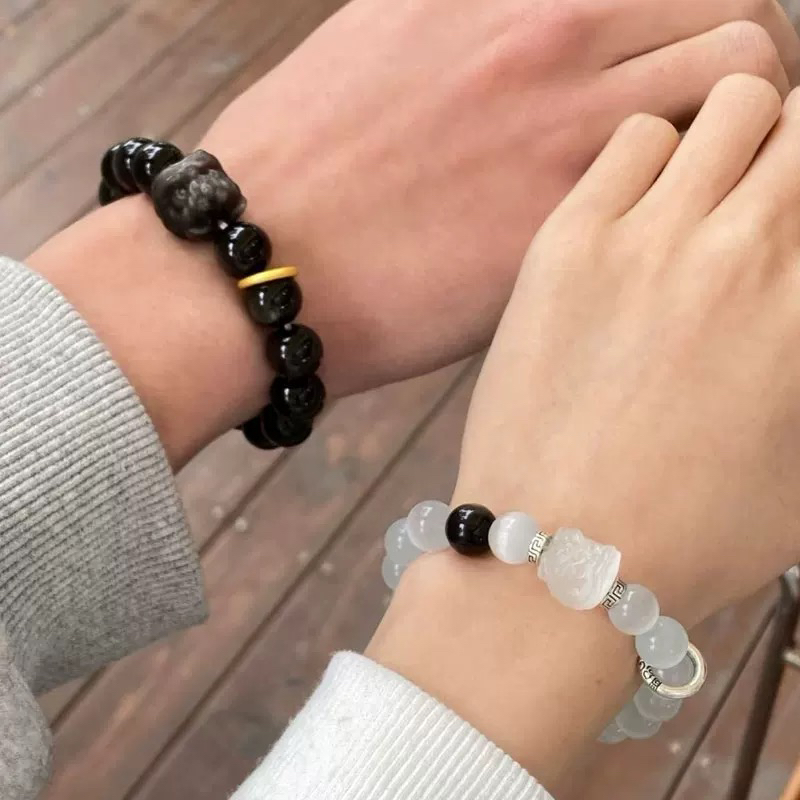 天然银曜石猫眼石水晶手链男女醒狮转运珠情侣手串一对七夕礼物