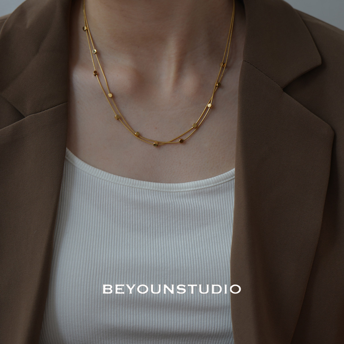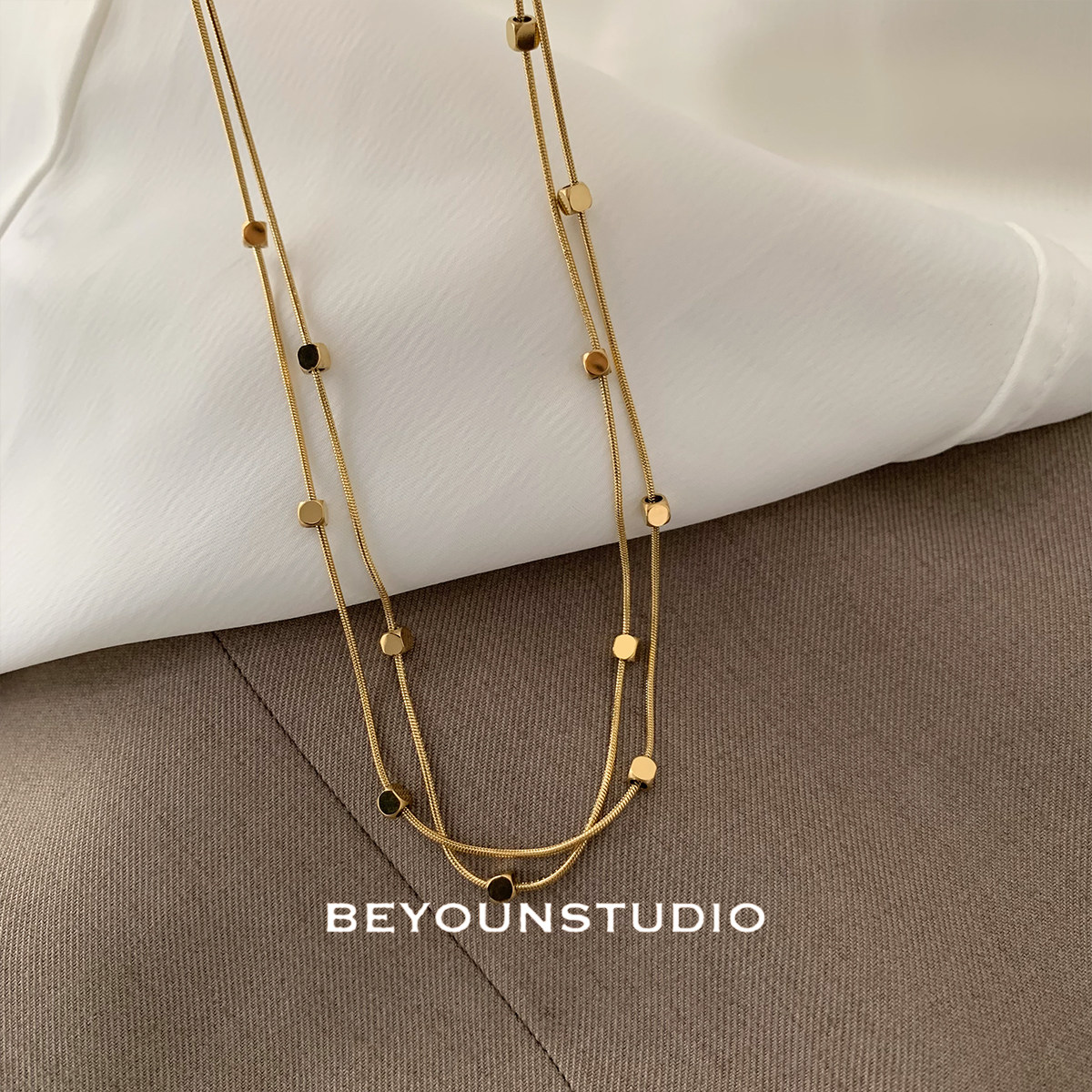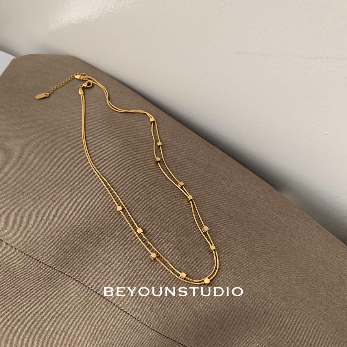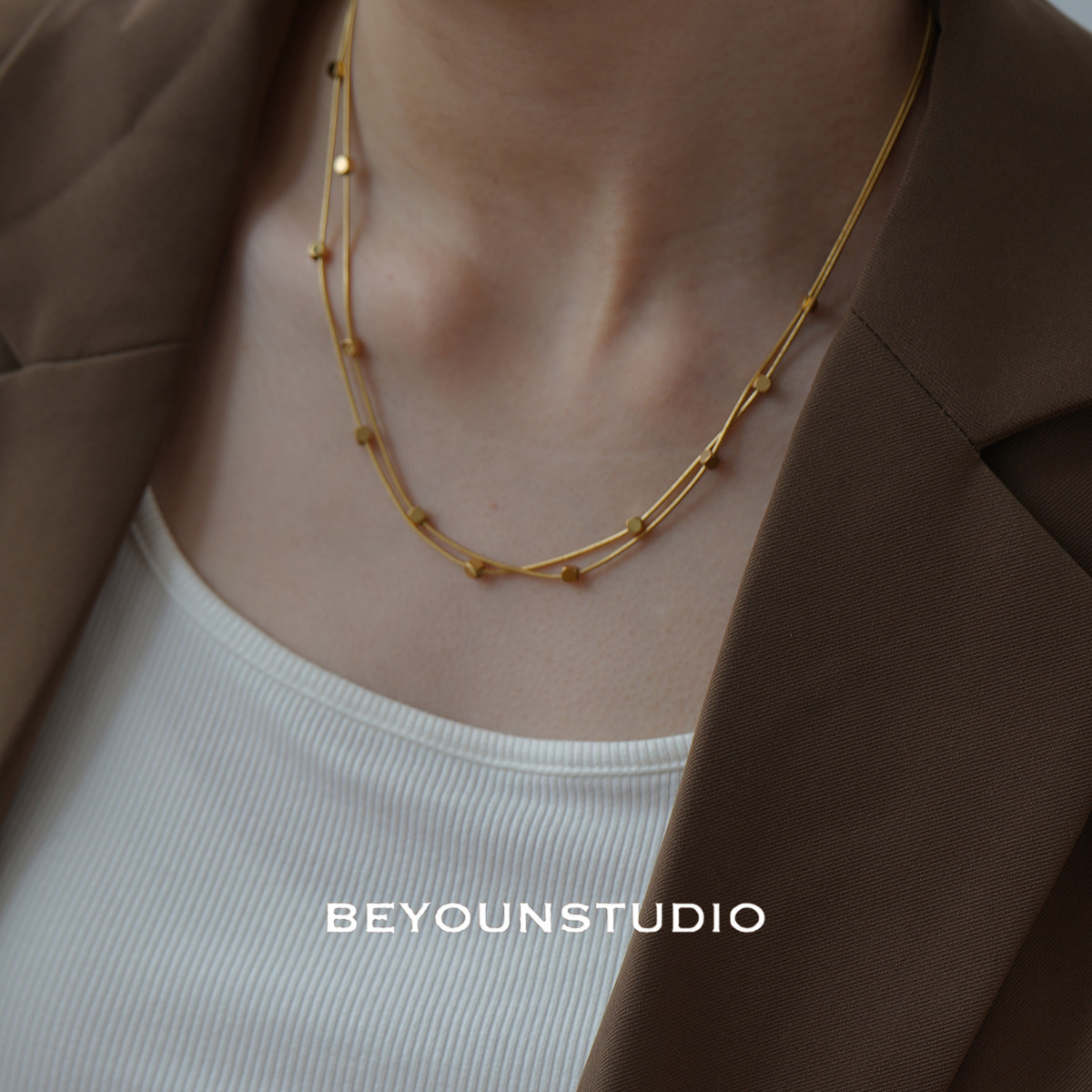 ZUORAN 时尚小众设计金色双层方块项链休闲百搭气质钛钢锁骨链133