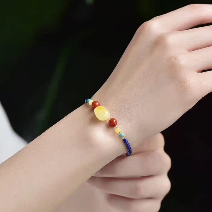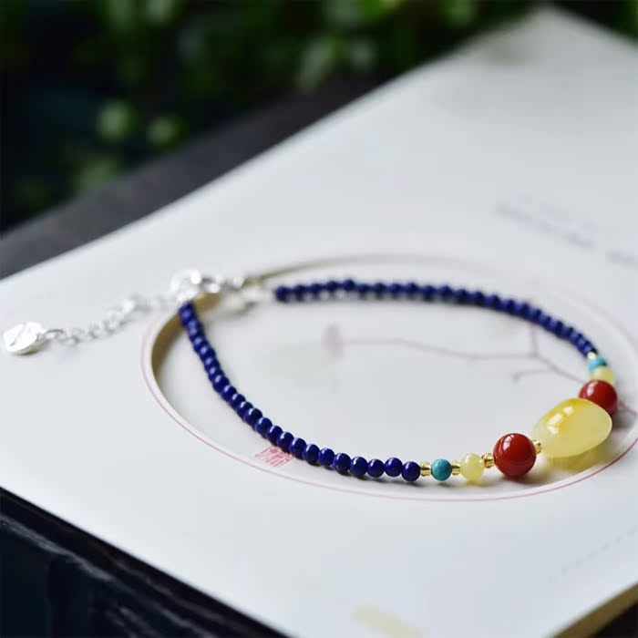 天然青金石手链 帝王青金石配不定型随型蜜蜡手链 925银链
