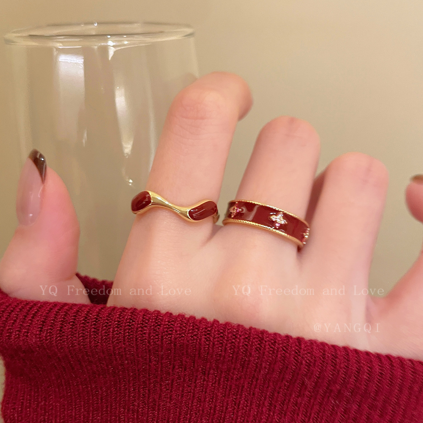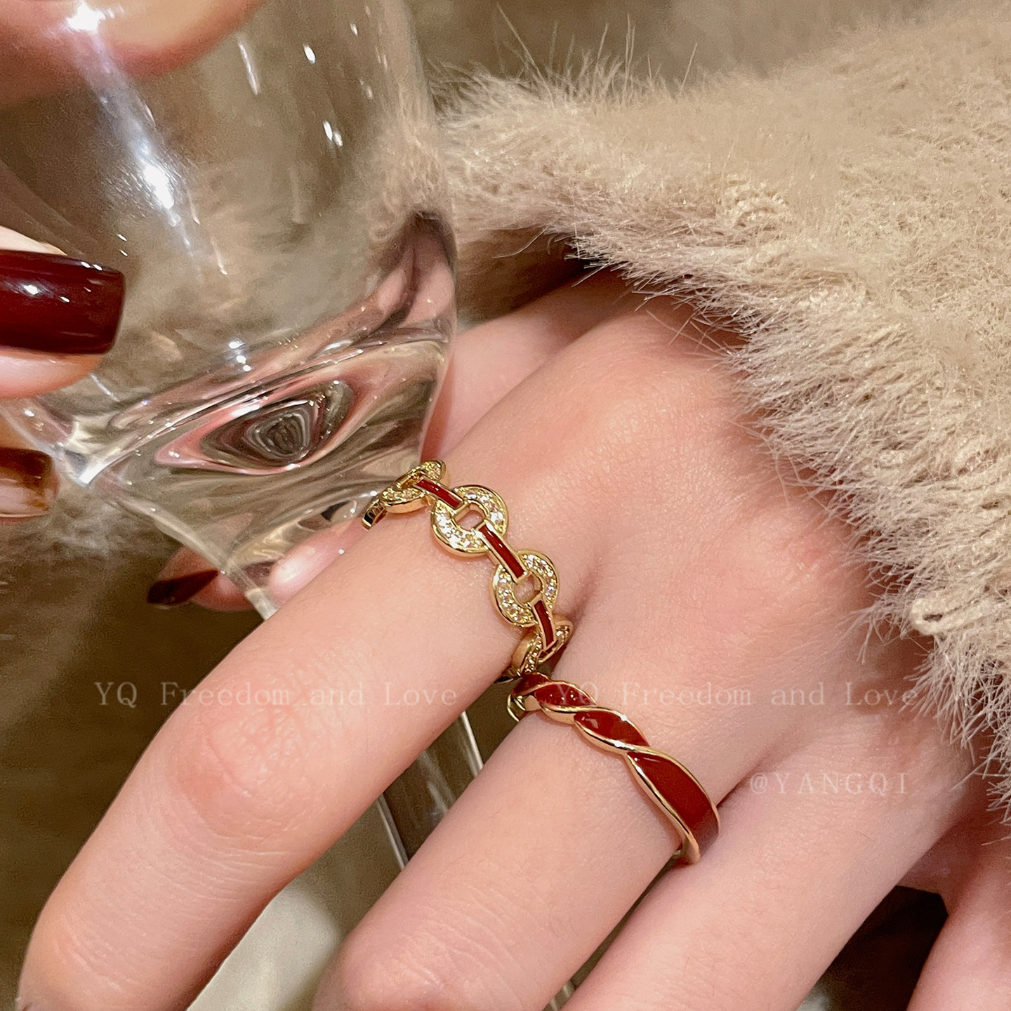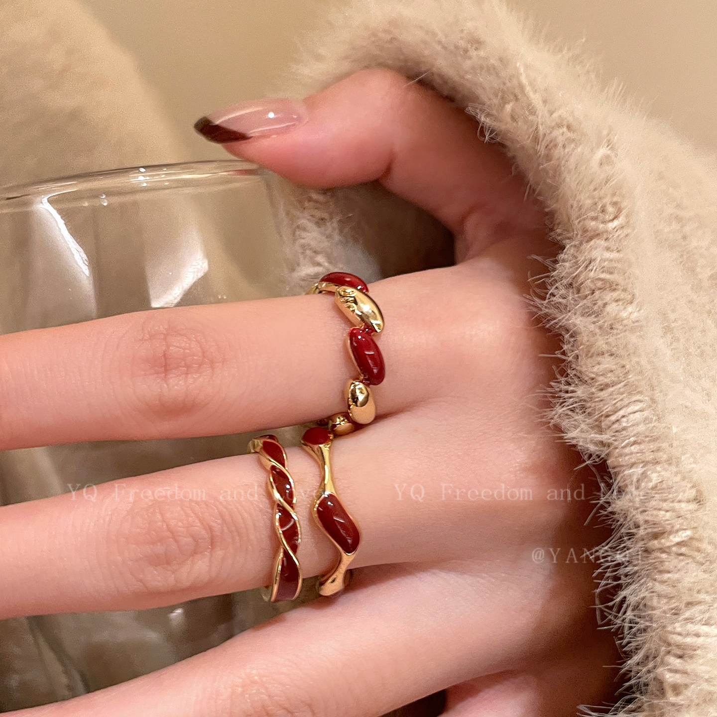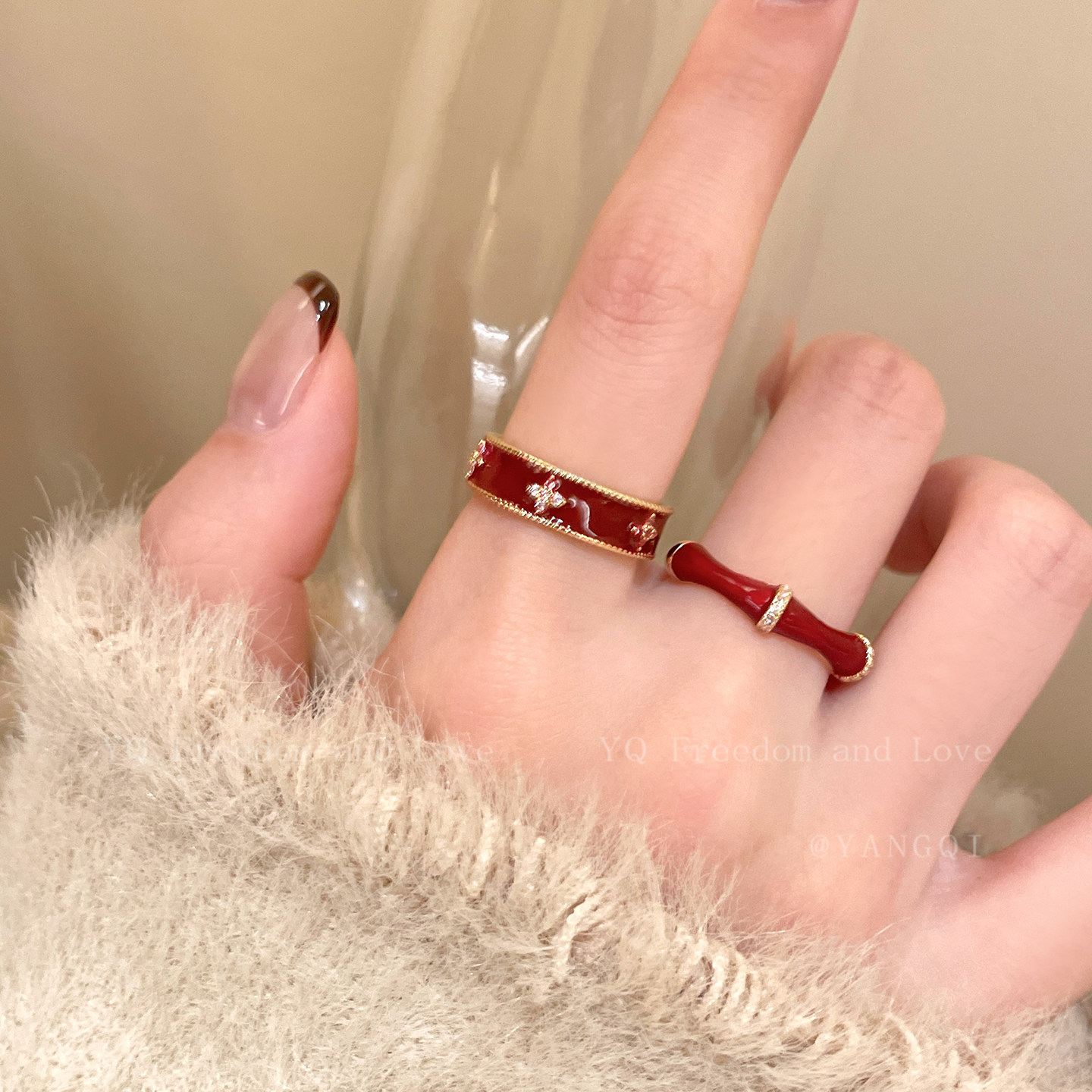 安可拉红色铜钱竹节开口戒指女轻奢高级感显白食指戒复古叠戴指环
