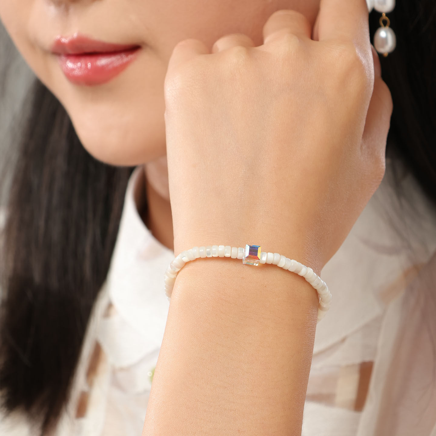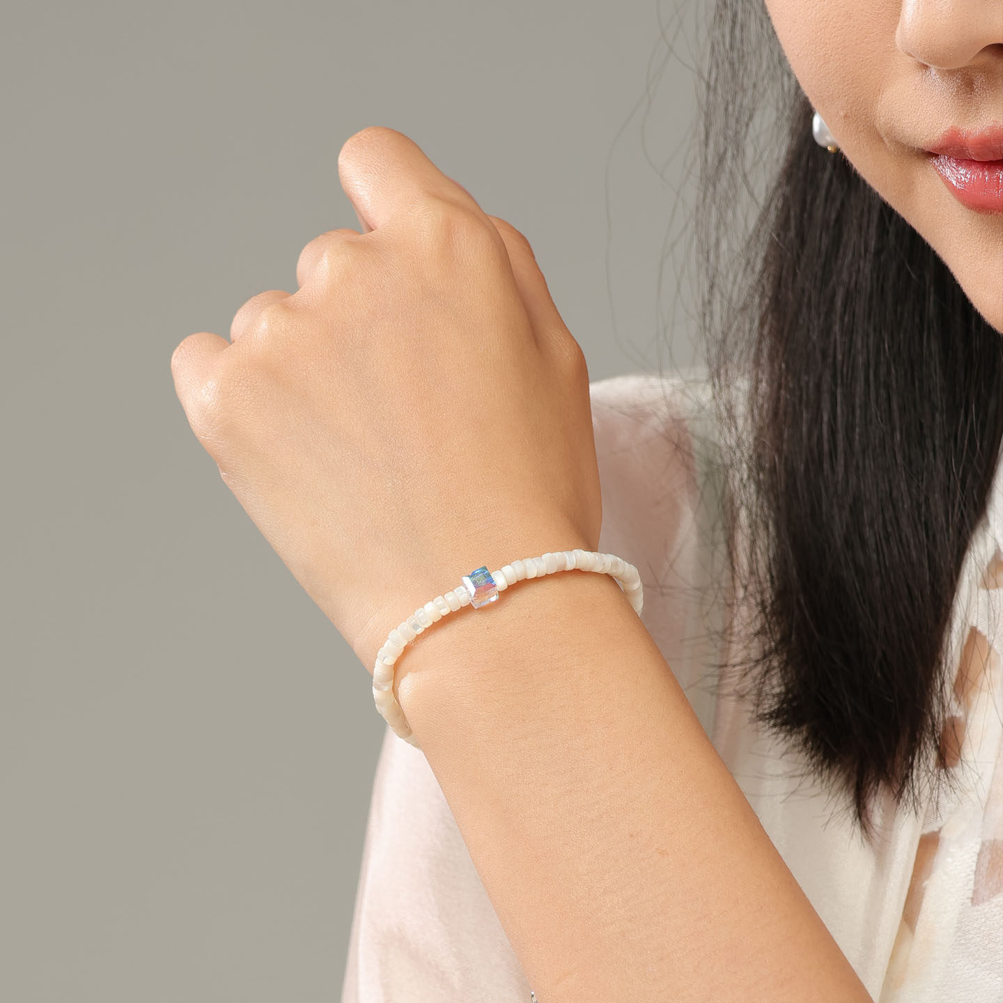 天然贝壳扁珠子白色幻彩水晶手链女S925银复古极细手串珠串时尚