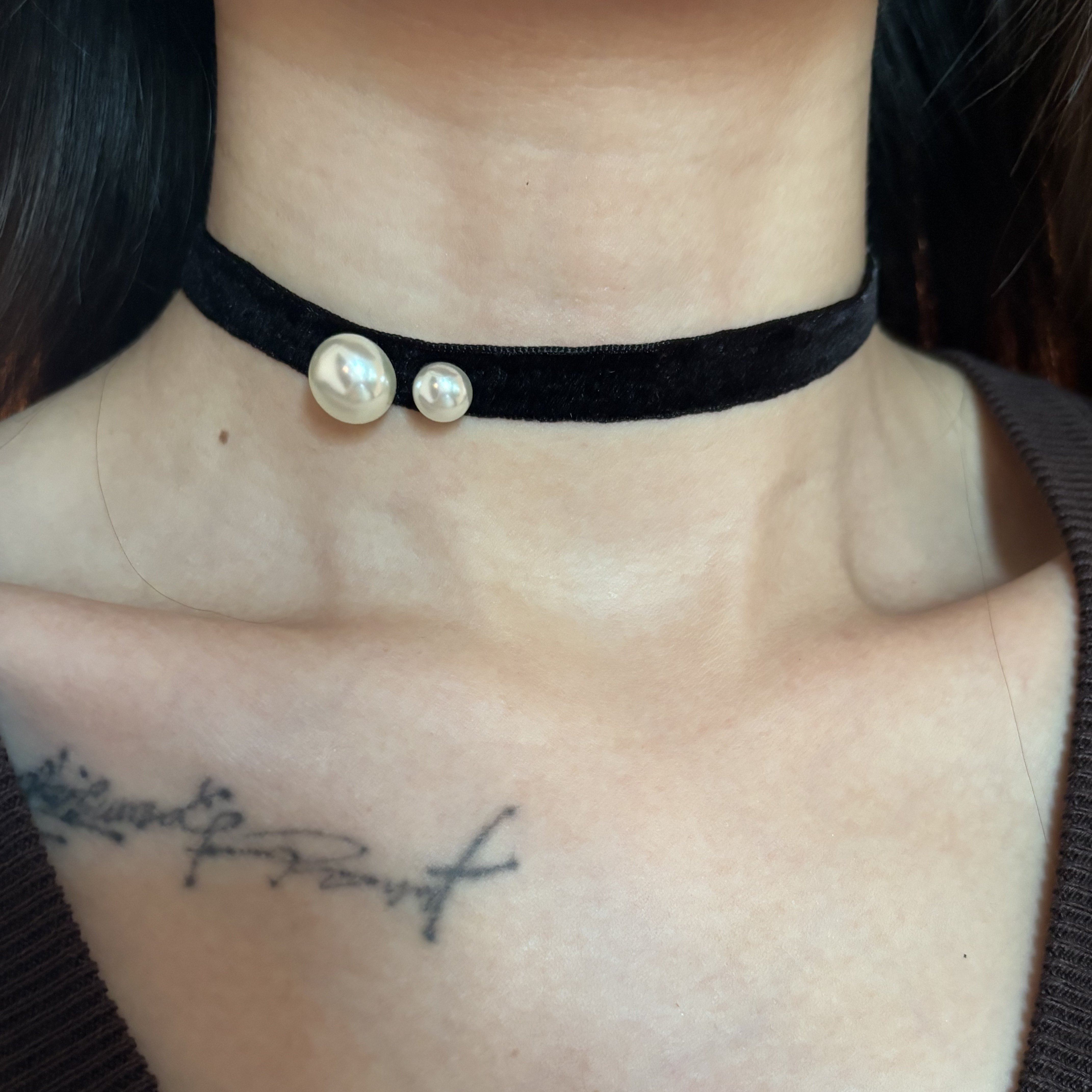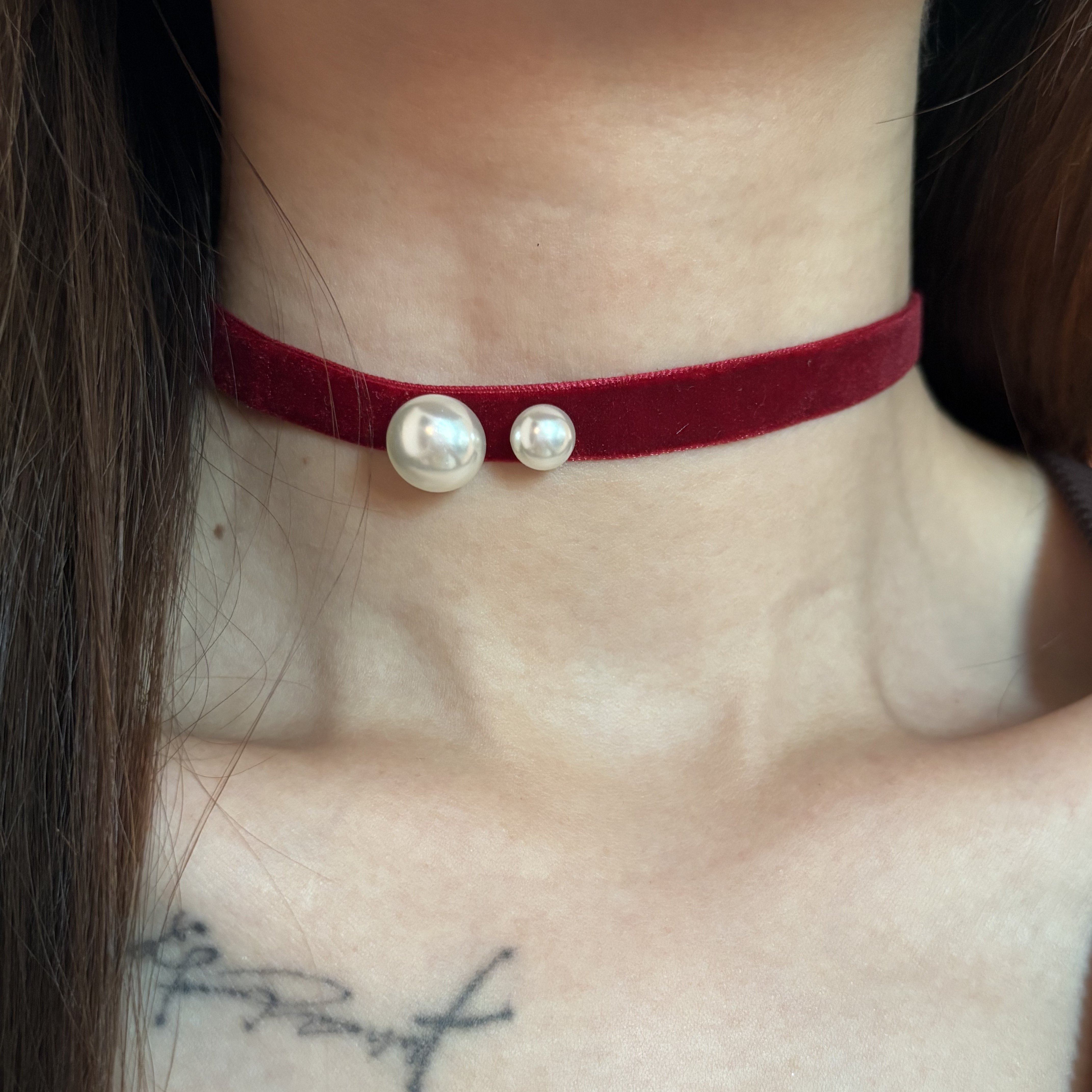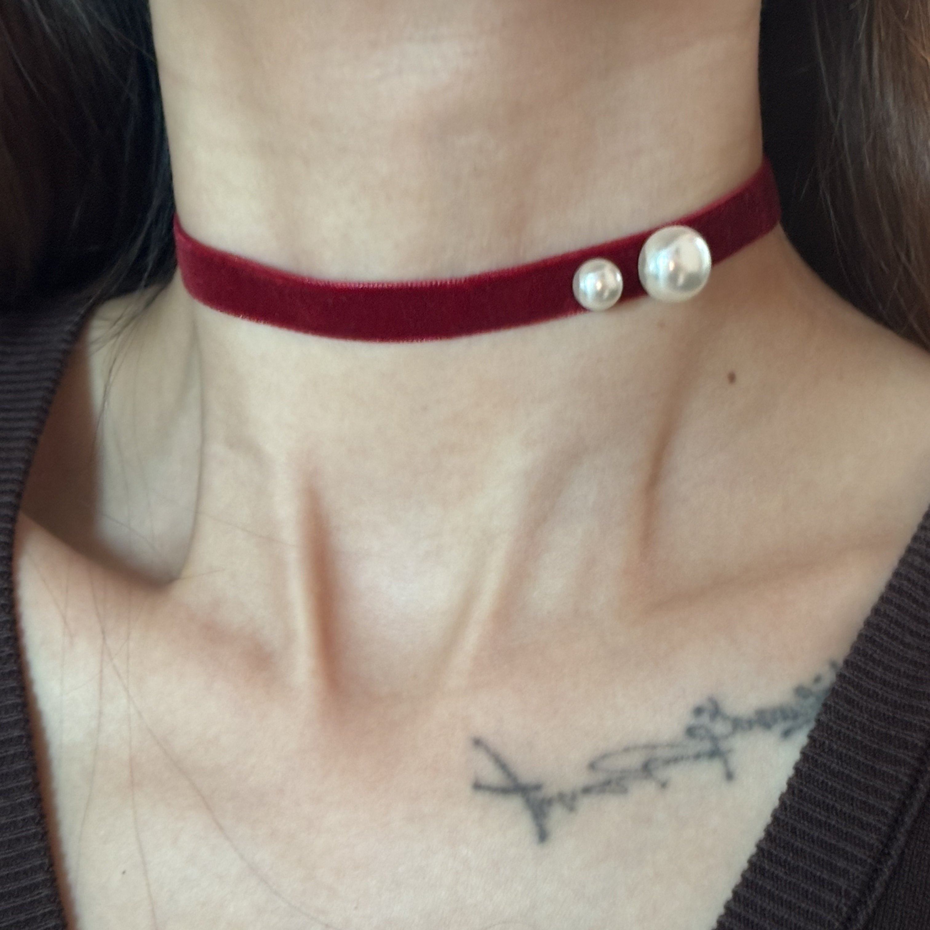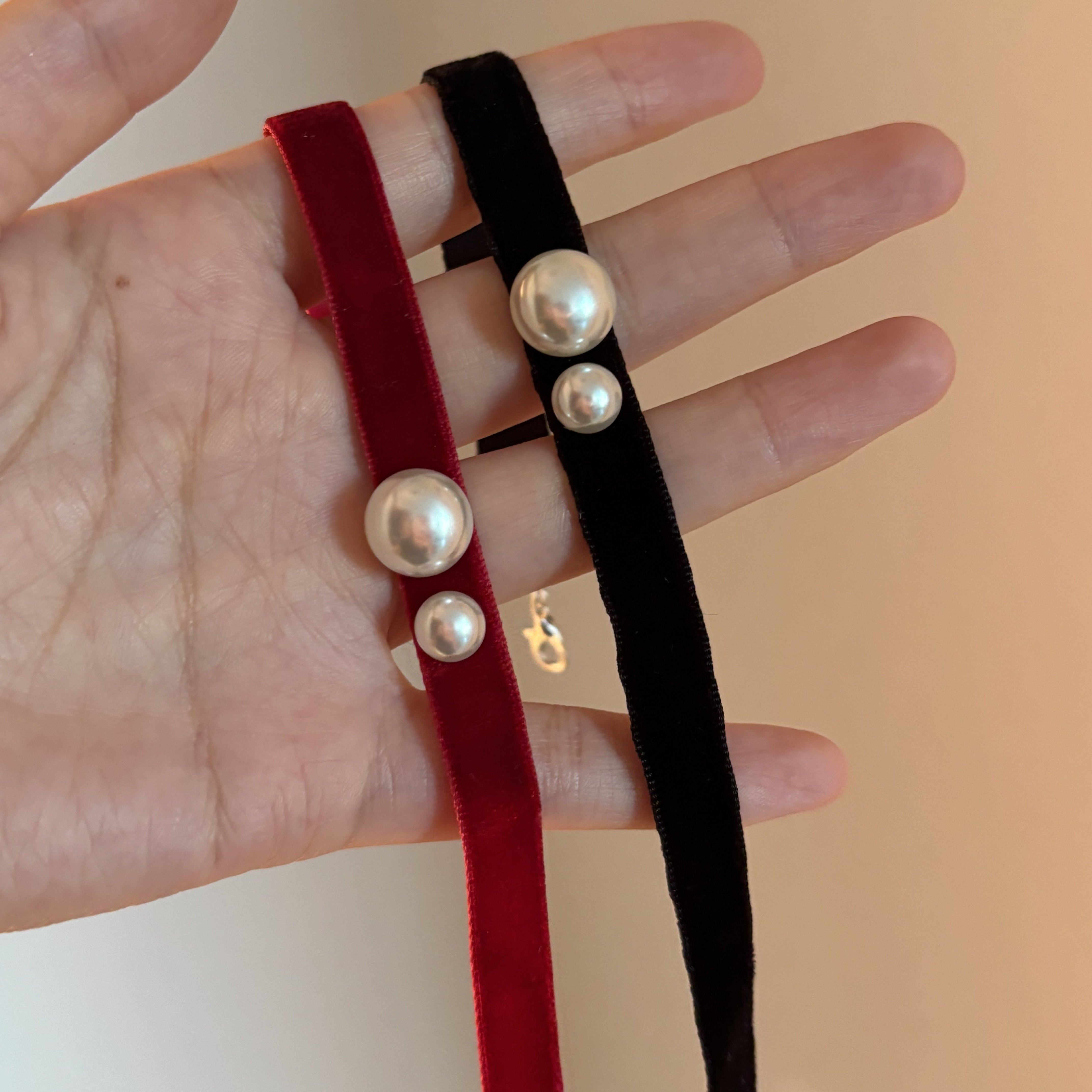 [楼哈哈]红色丝绒珍珠项链choker短款颈链气质锁骨链礼服项圈女