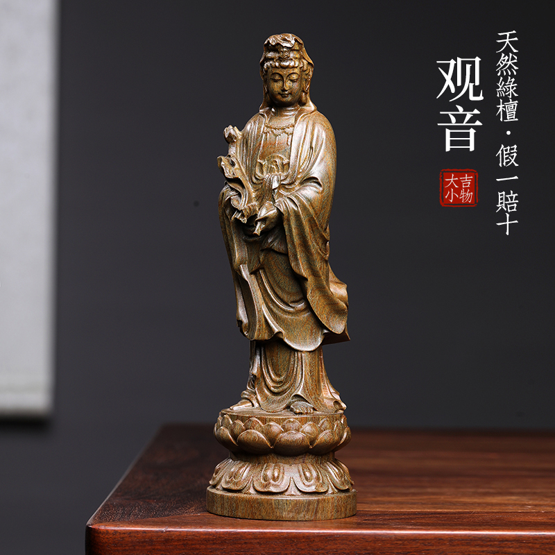 天然绿檀实木雕刻观音摆件文玩手把件人物工艺品客厅家居装饰品