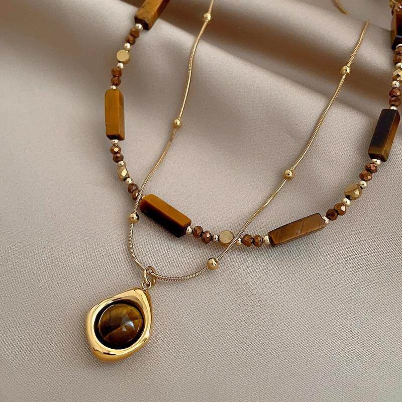 MaisonCleo复古气质叠戴虎眼石款吊坠项链女秋冬款双层锁骨链毛衣