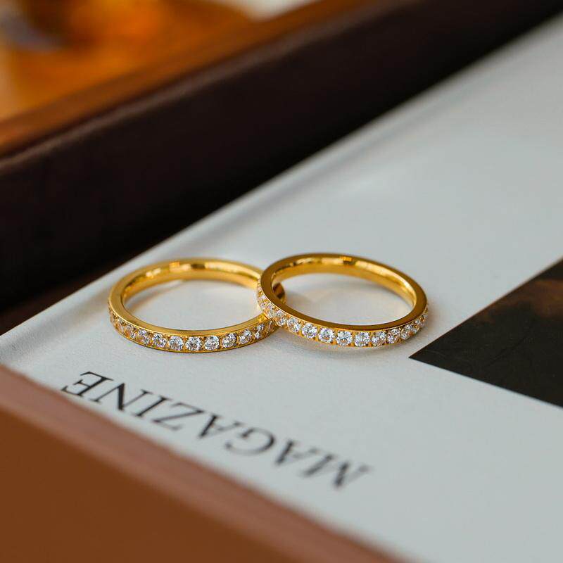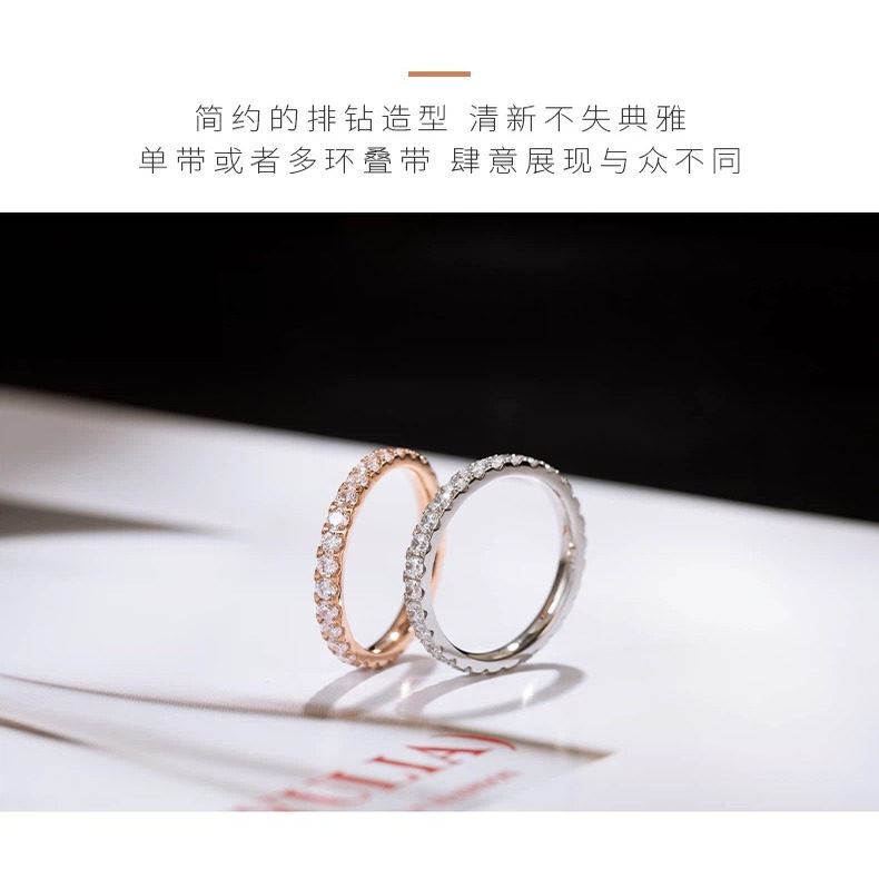 Rusizi超闪满钻莫桑钻素圈女戒指18K金叠带小众男指环排镶不褪色