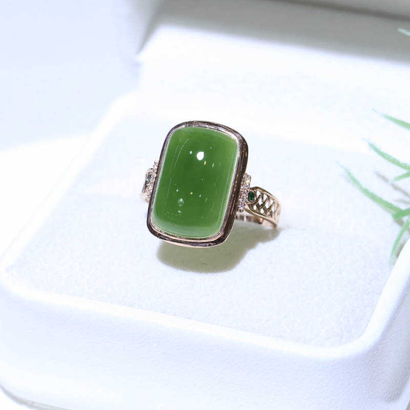 暑期礼品天然碧玉戒指18K金镶菠菜绿和田玉方形指环a货玉石戒圈女
