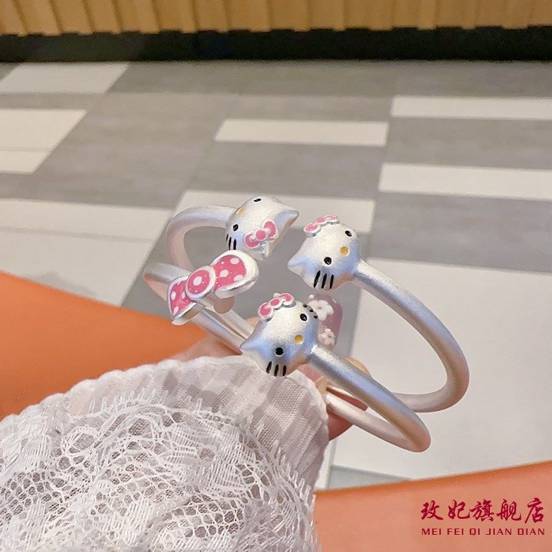玫妃kt猫头蝴蝶结开口纯银手镯足银9999女中大童学生小孩生日礼物
