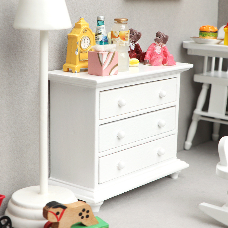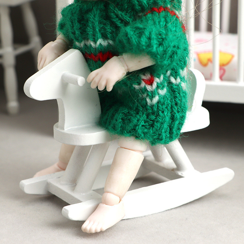 热销1:12小床dollhouse迷你家具白色儿童房套装娃娃屋摇椅摇马柜