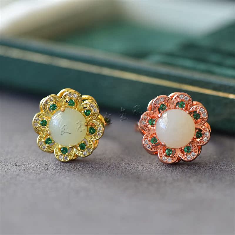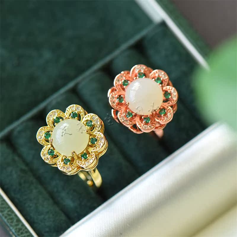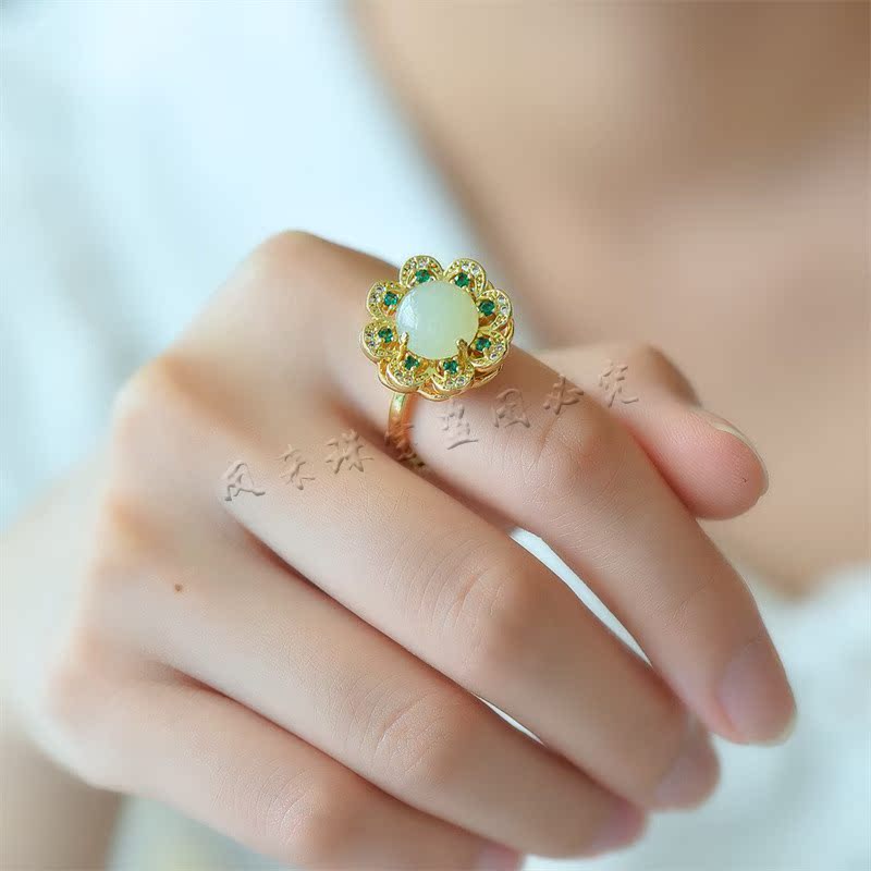 天然和田玉白玉圆珠太阳花戒指个性百搭指环女款镶嵌防过敏戒子