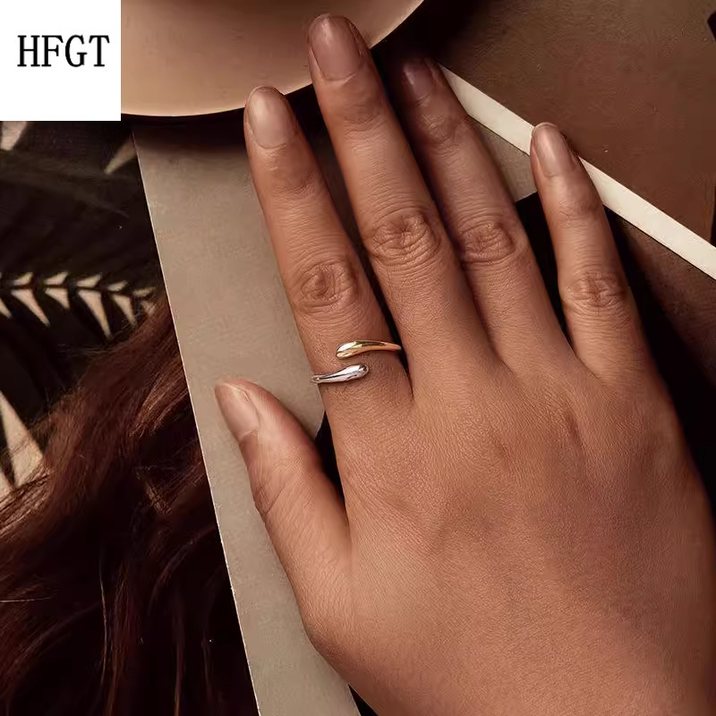 百搭双色高端水滴开口戒时尚通勤s925纯银金色个性可调节戒指女
