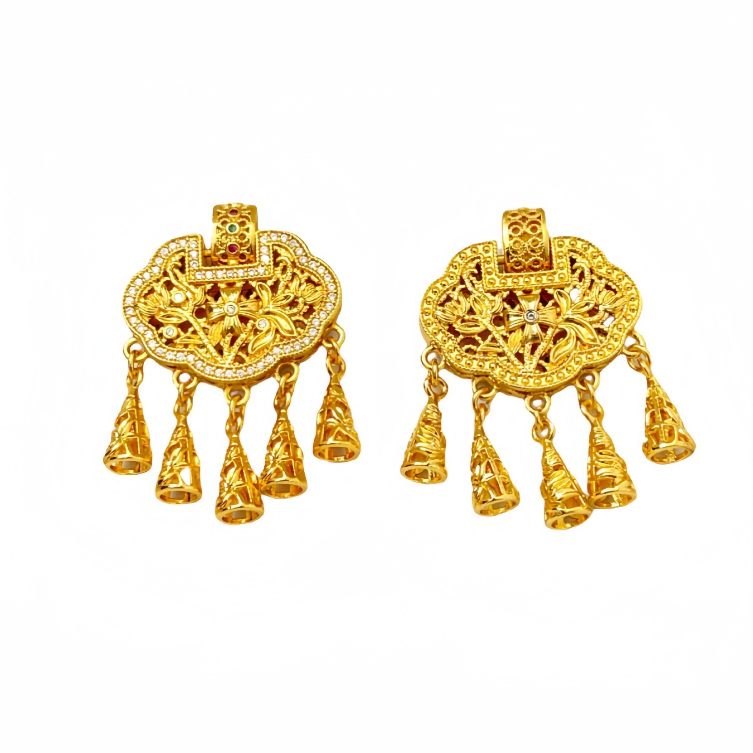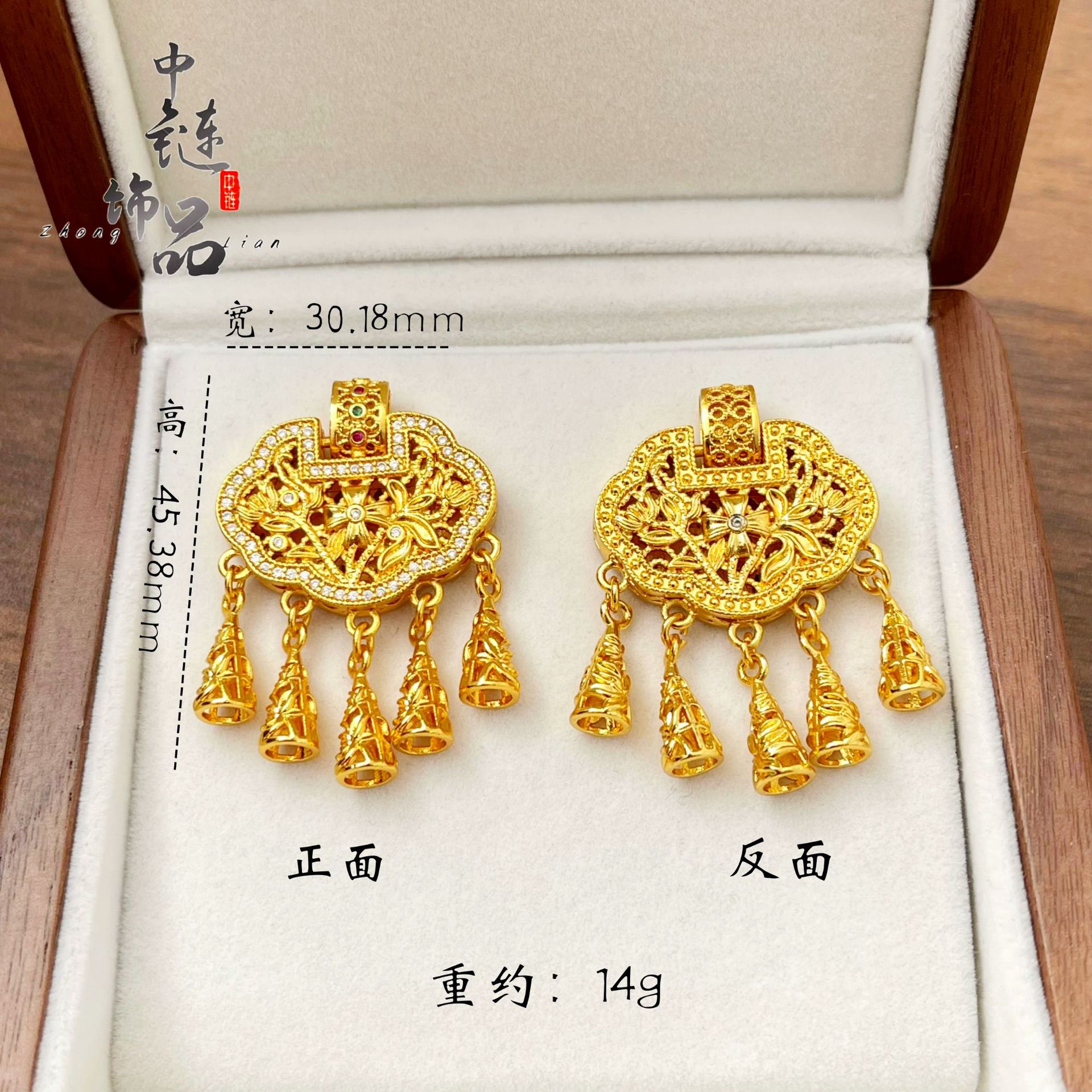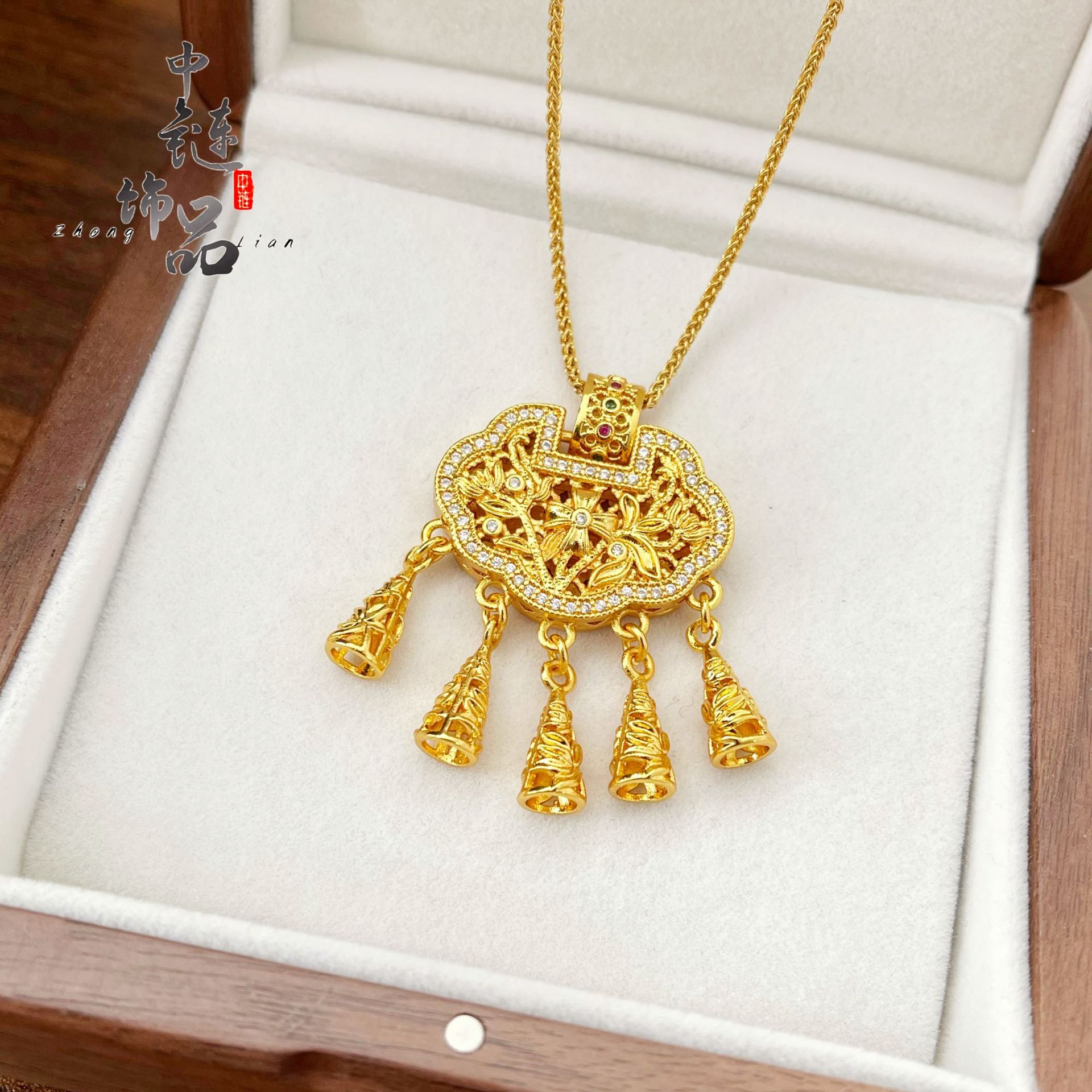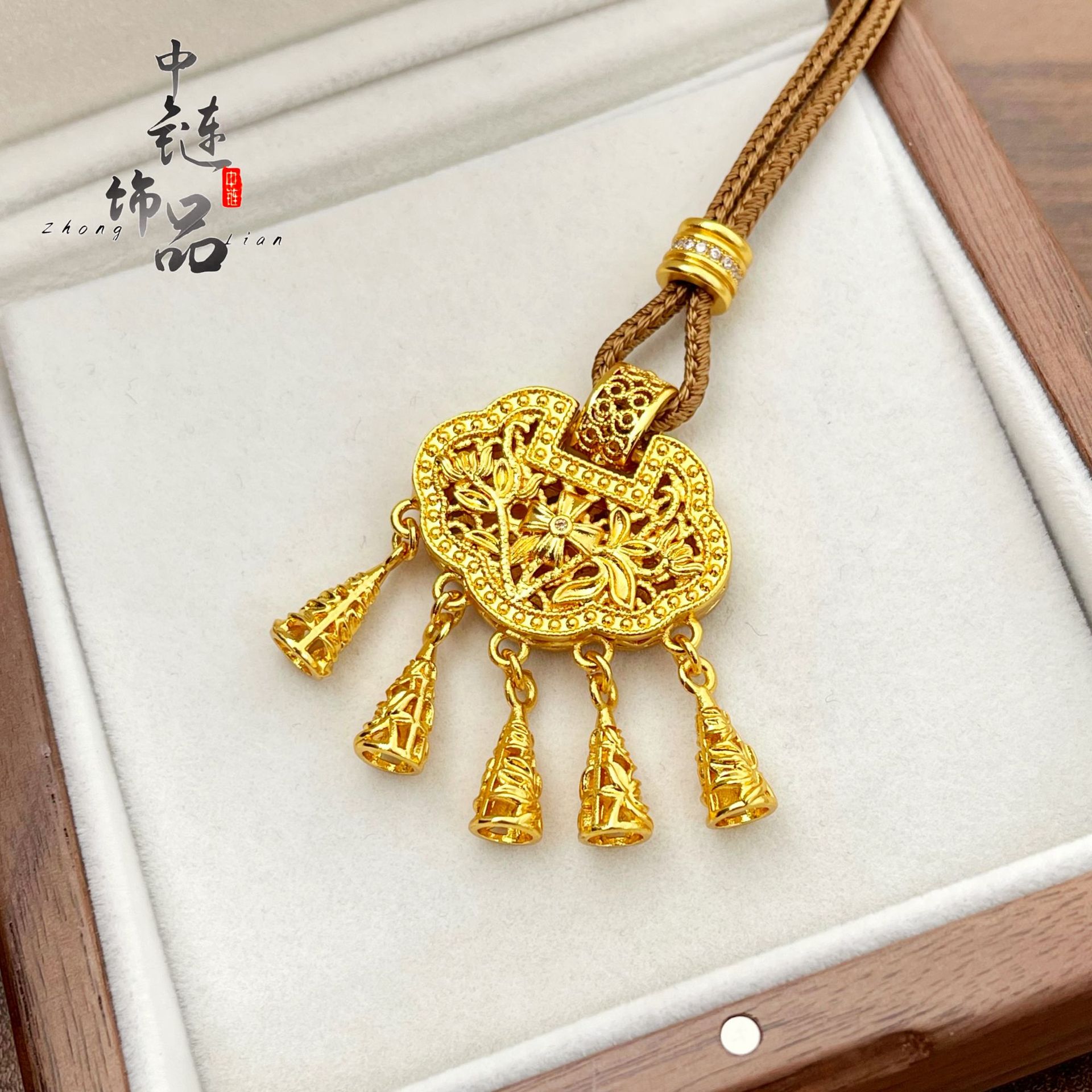 古法越南沙金厚金镶钻铃铛花枝如意锁吊坠微镶镂空花丝长命锁包