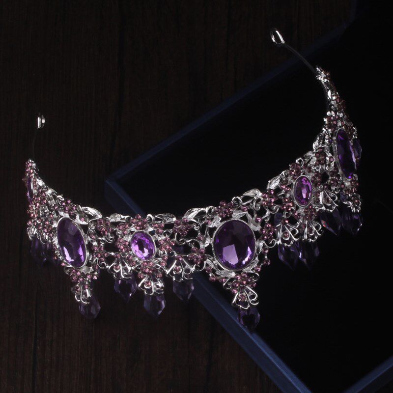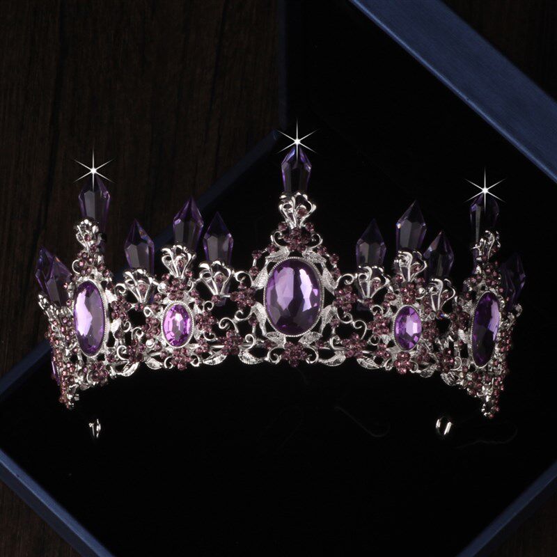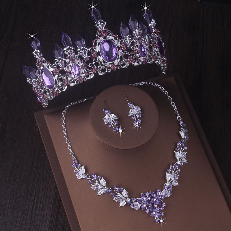 高端大气新娘套链女王紫色水晶柱皇冠水钻婚纱项链耳环三件套饰品