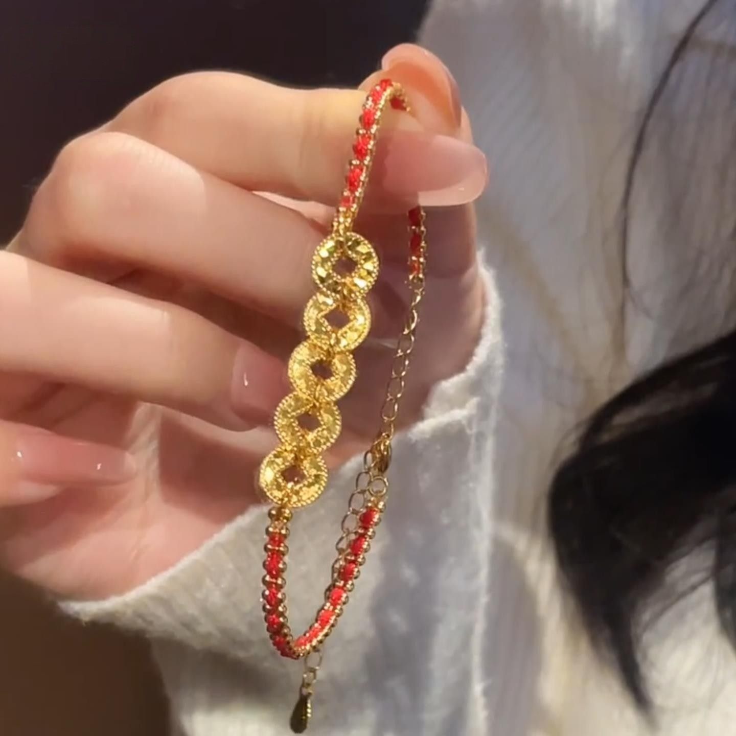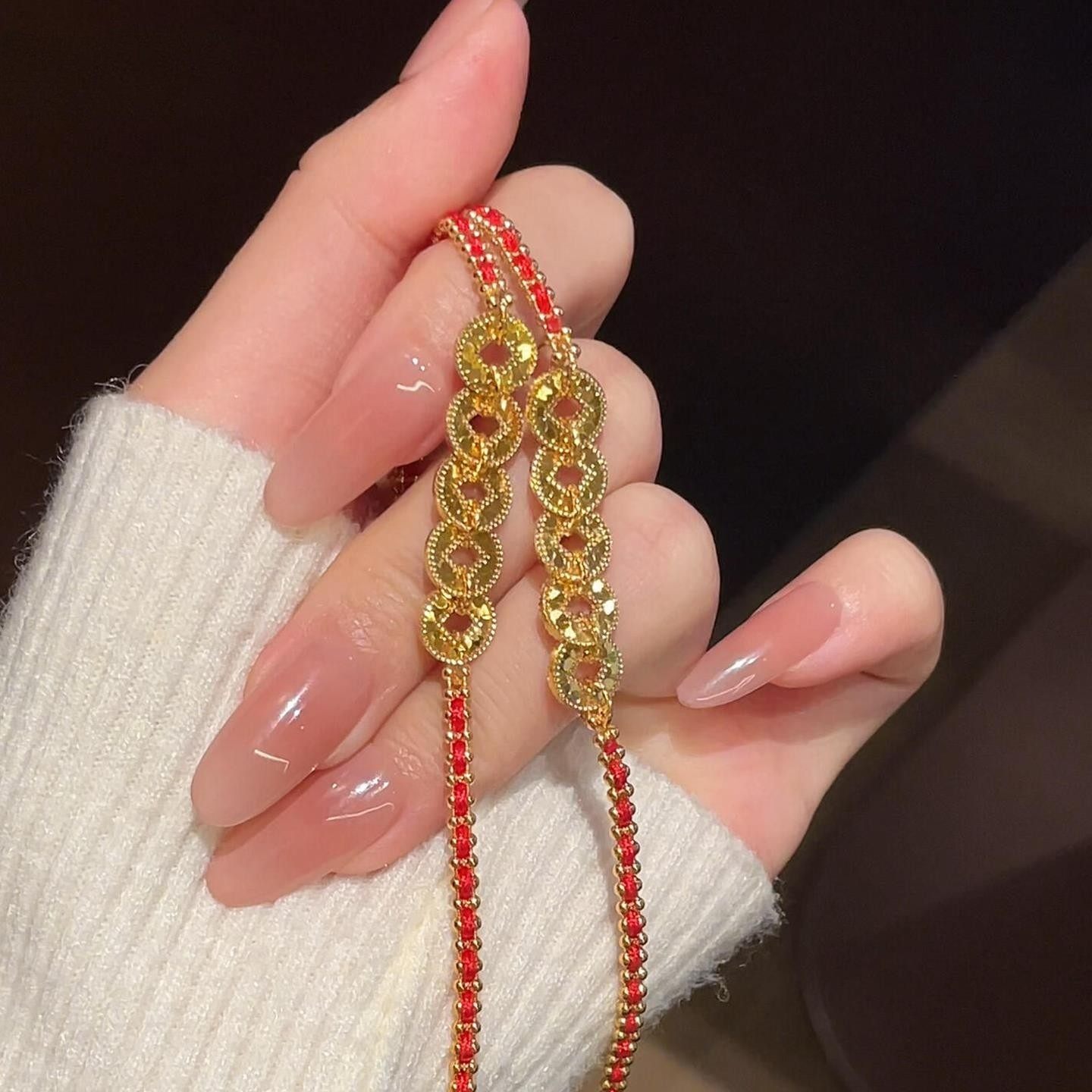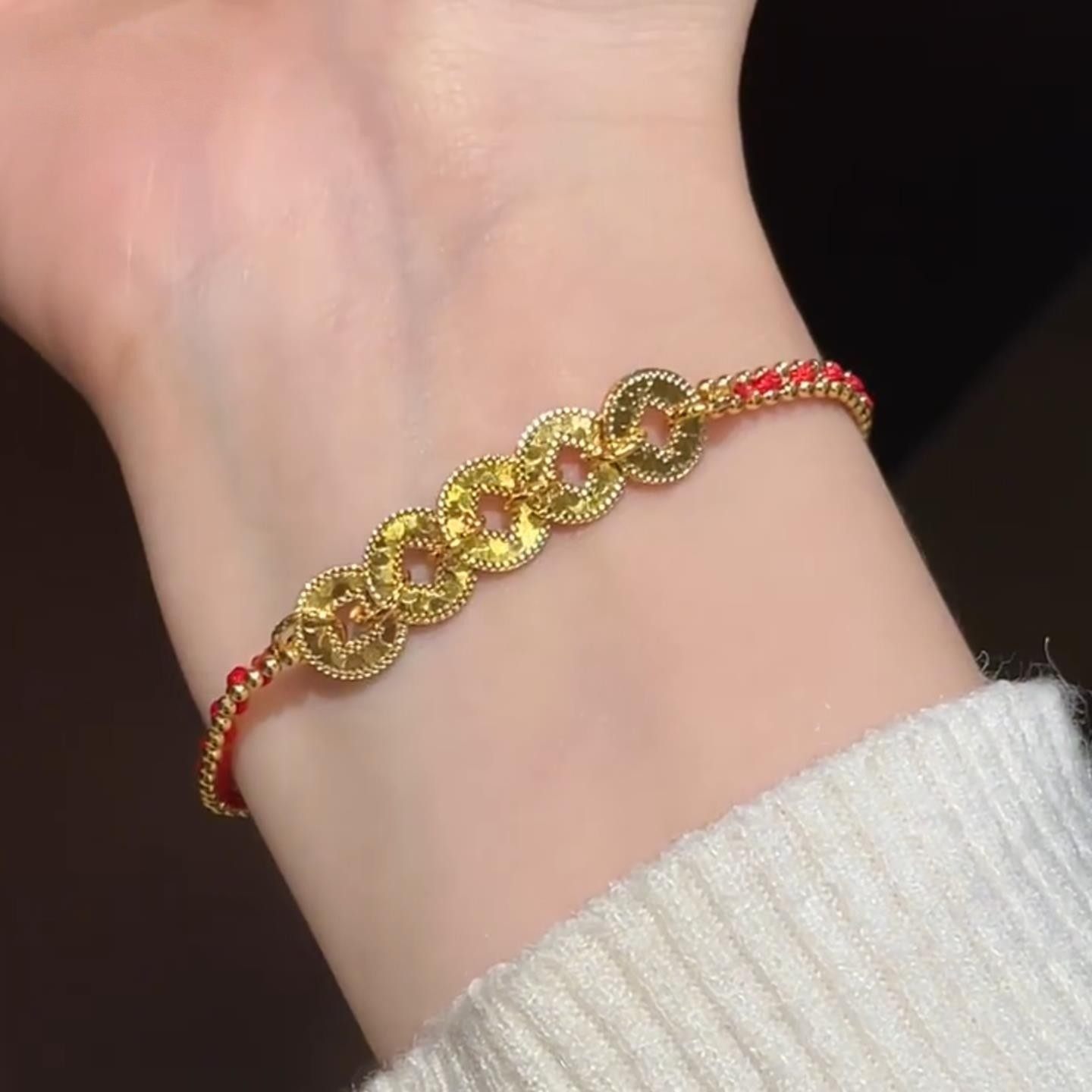 爆闪红色编织绳五帝铜钱币手链女款国风黄色本命年碎冰冰手饰复古