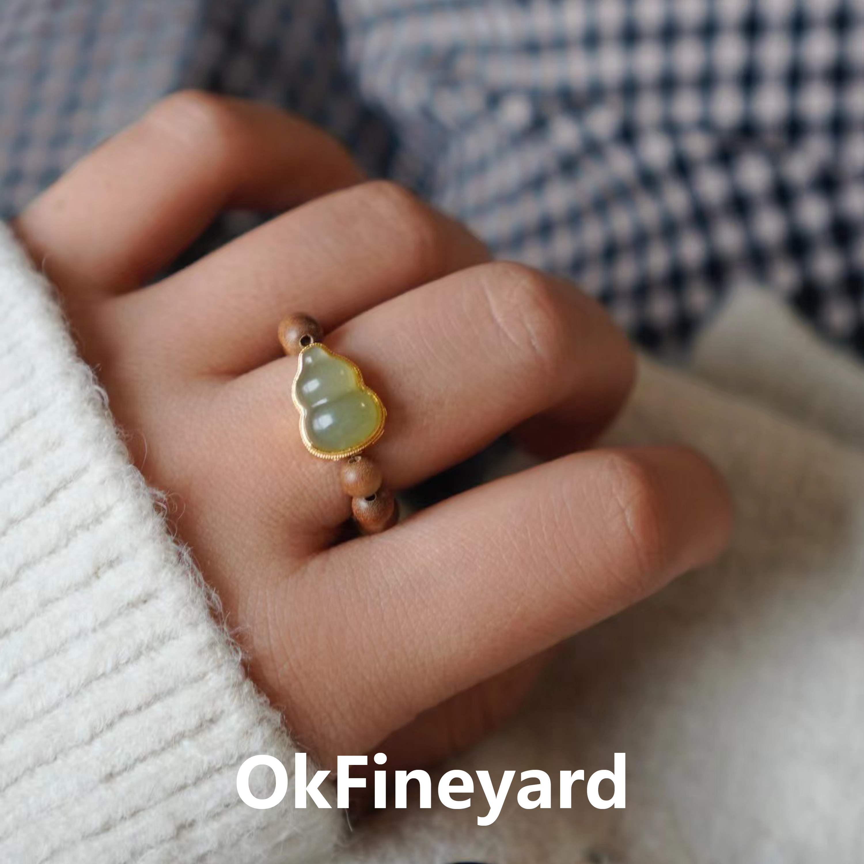 OkFineyard印度老山檀香戒指女款翡翠和田玉葫芦串珠中式小众设计