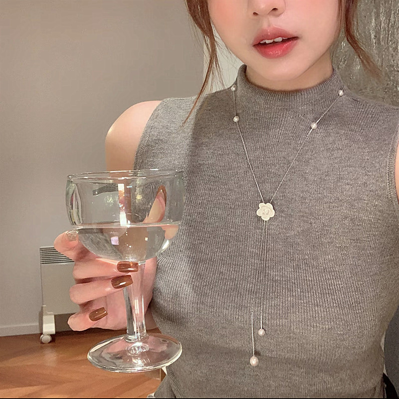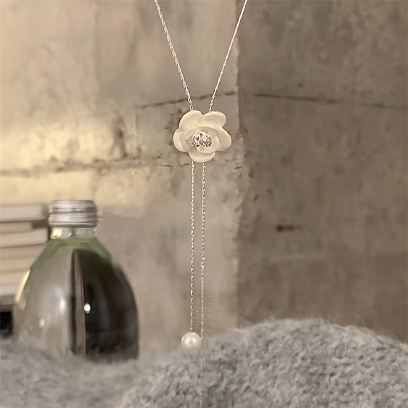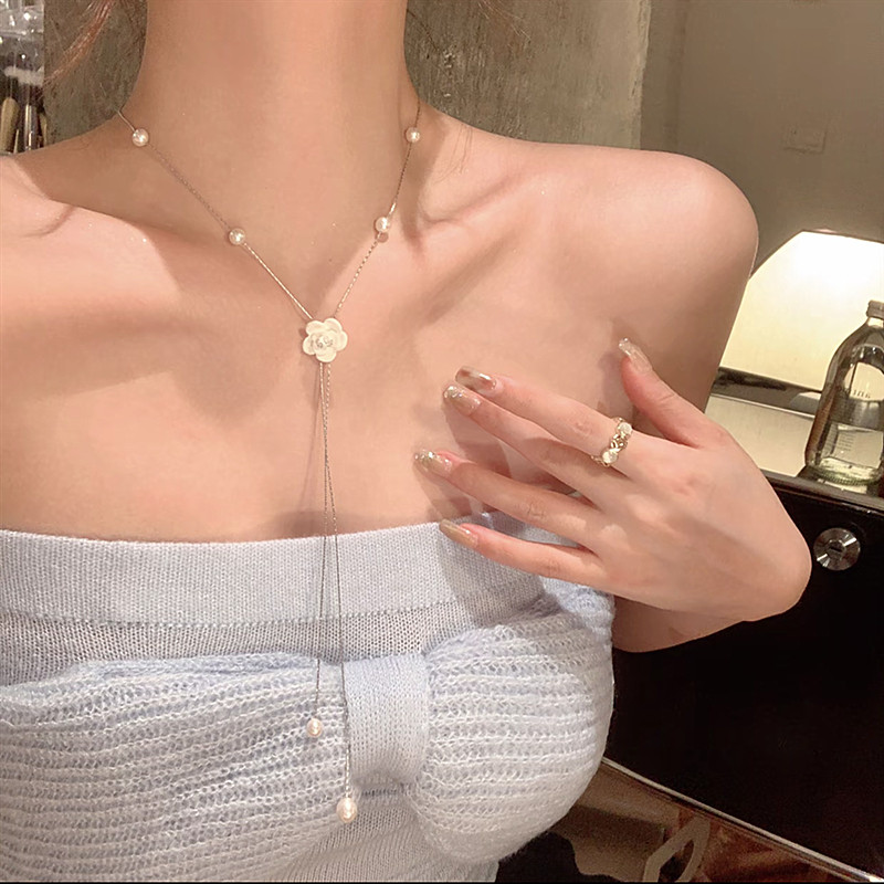 新款白色珍珠山茶花毛衣链可抽拉设计长款女简约小众独特高级感女