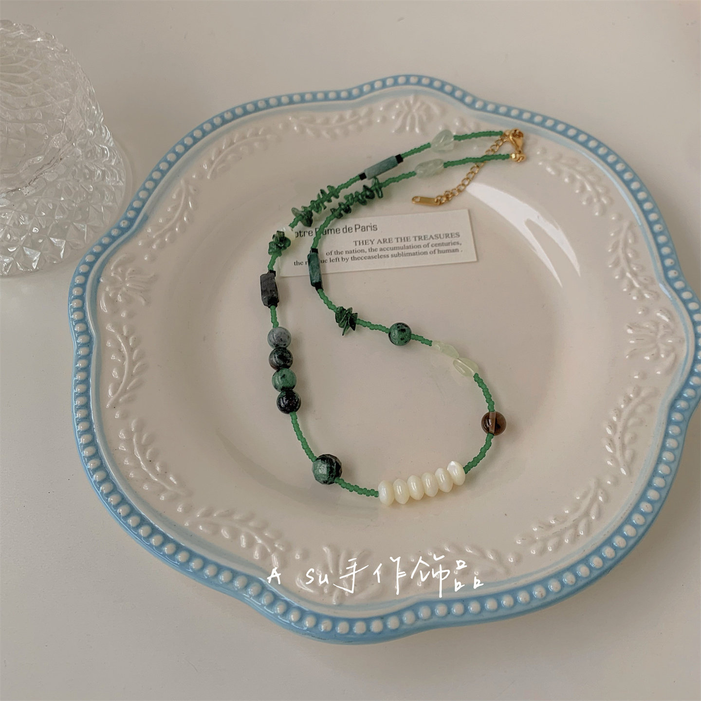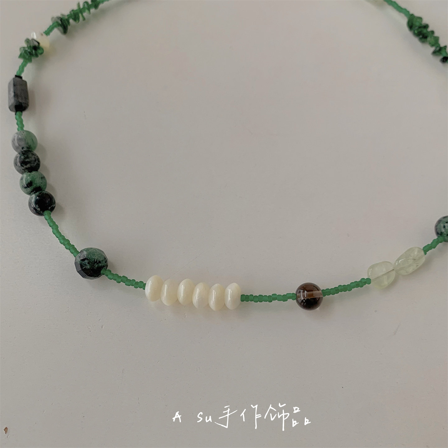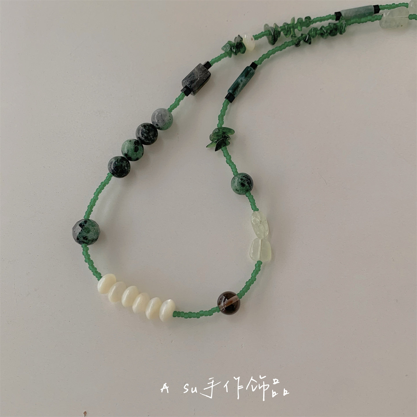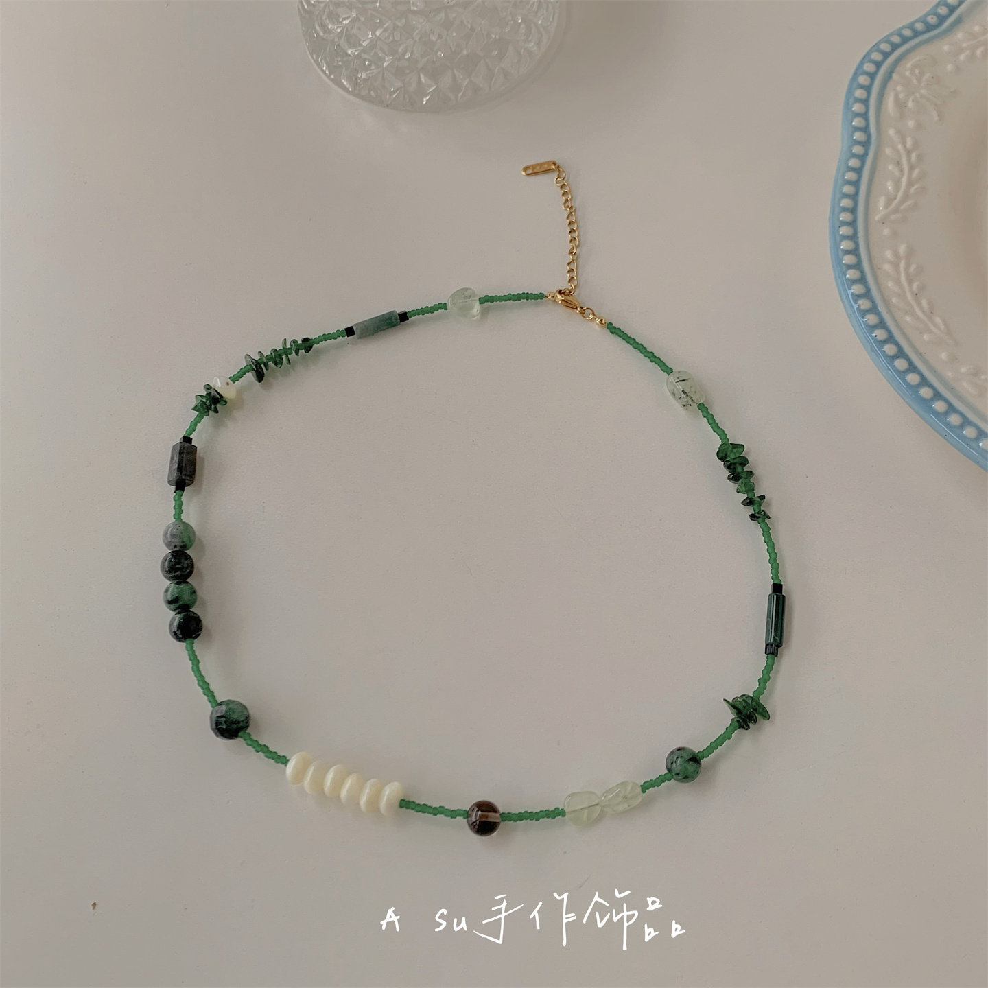 【满25包邮】天然石串珠项链女小众绿色系锁骨链米珠颈链