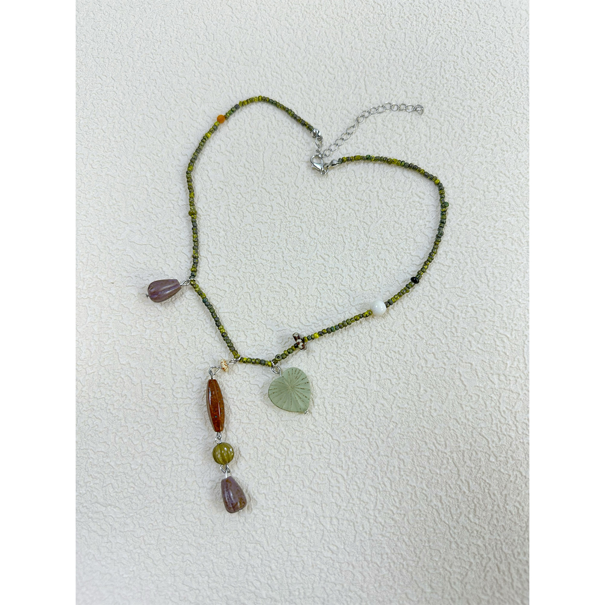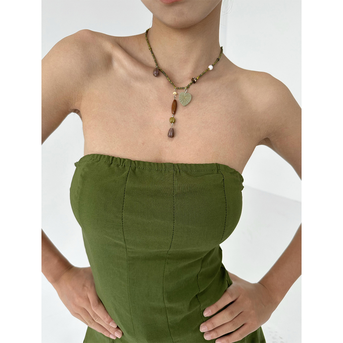 atmshop棕绿色复古气质手工珠串y形吊坠项链新中式小众时髦锁骨链