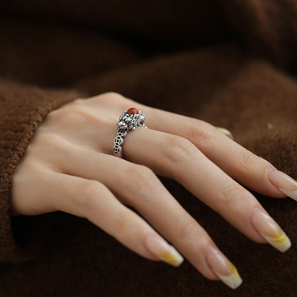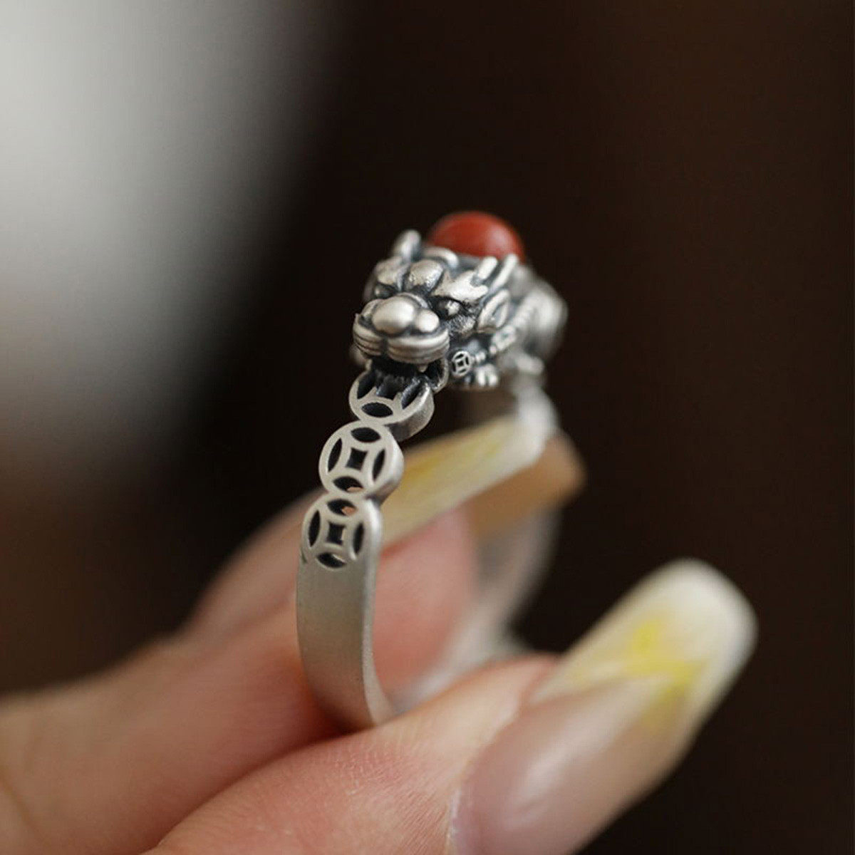 复古925银南红貔貅戒指新中式女小众高级感铜钱纹招财开口指环