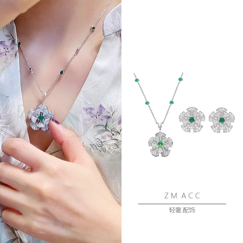热扎依同款扇形双层小扇子祖母绿满钻花瓣花簇银镀金项链锁骨链女