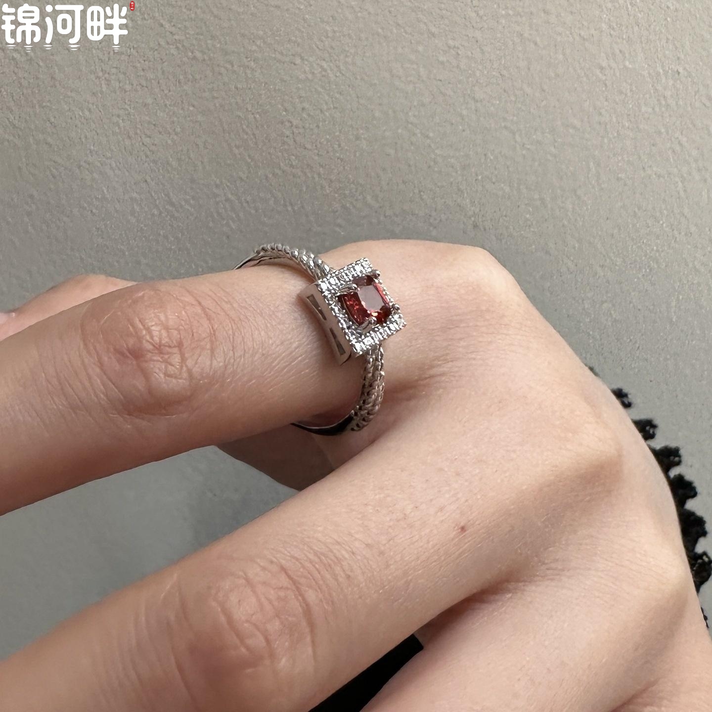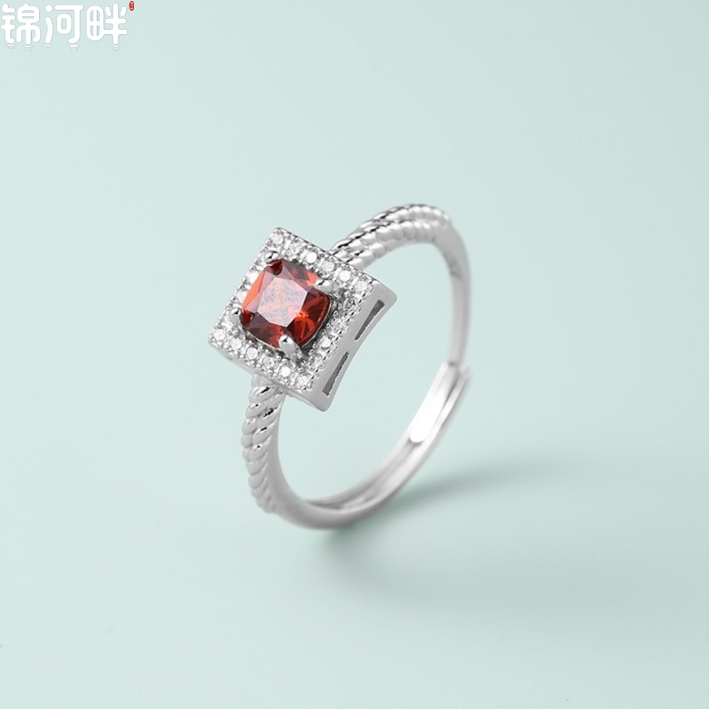 锦河畔 925纯银轻奢方形满钻红锆石戒指女简约时尚精致推拉设计高