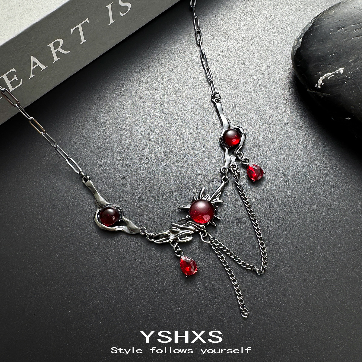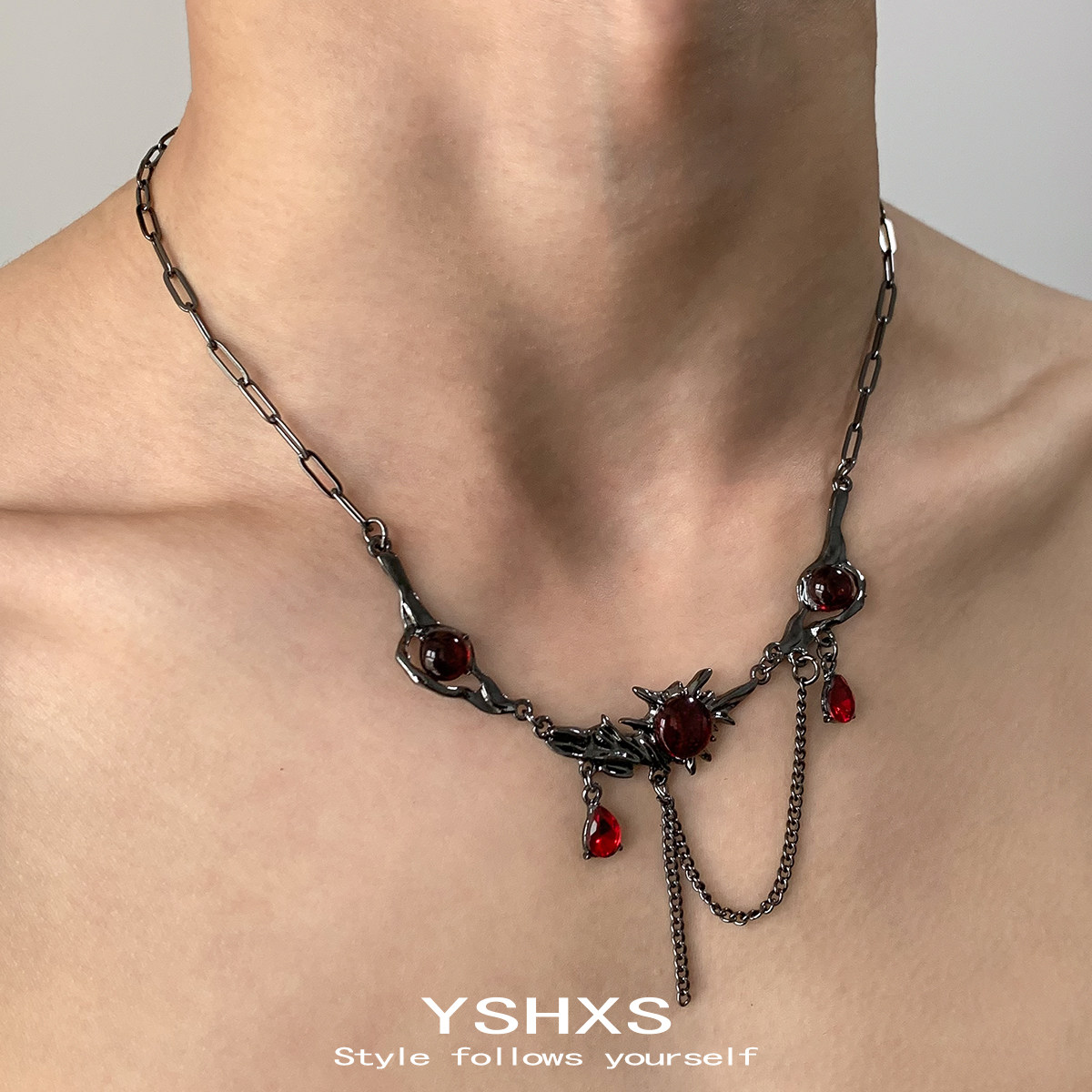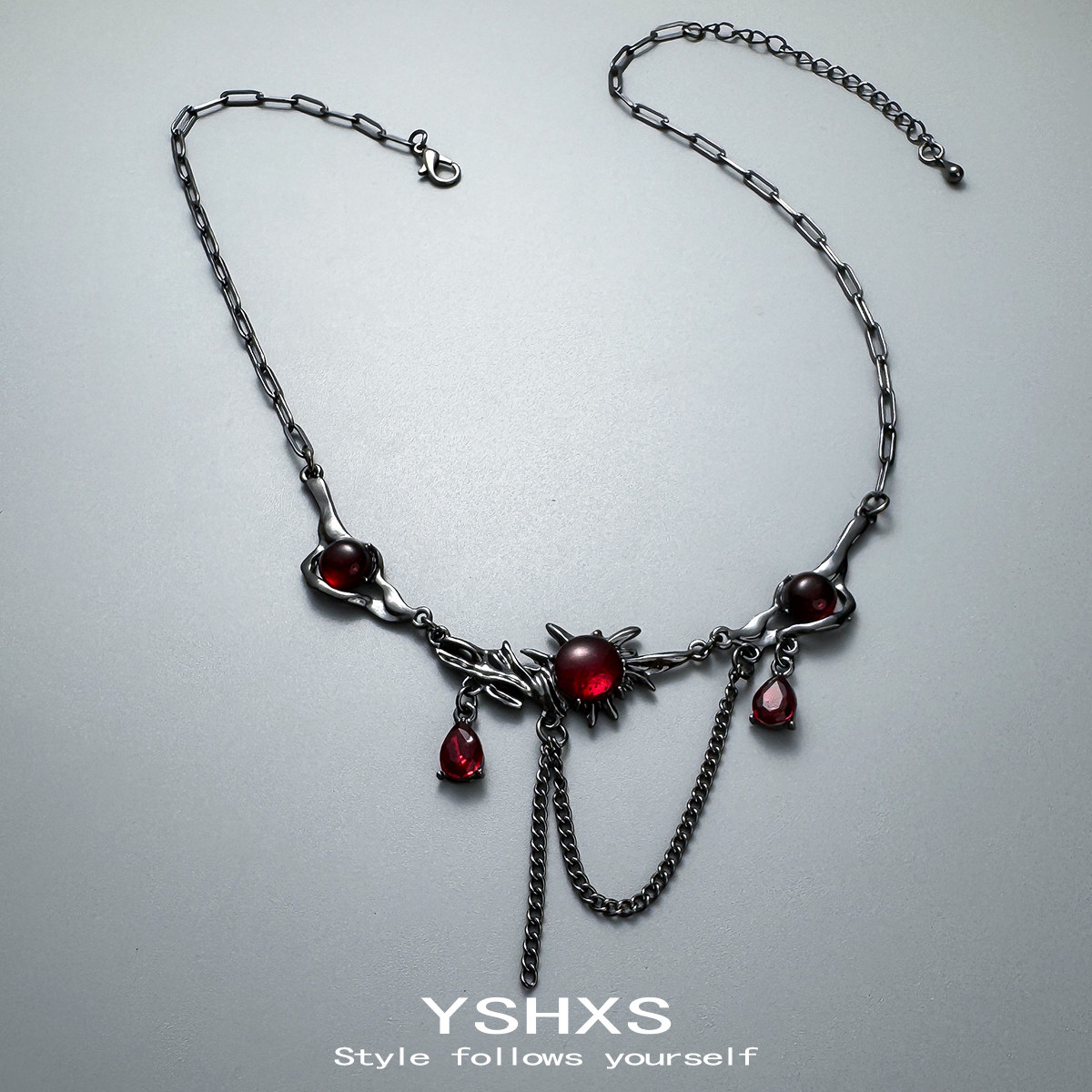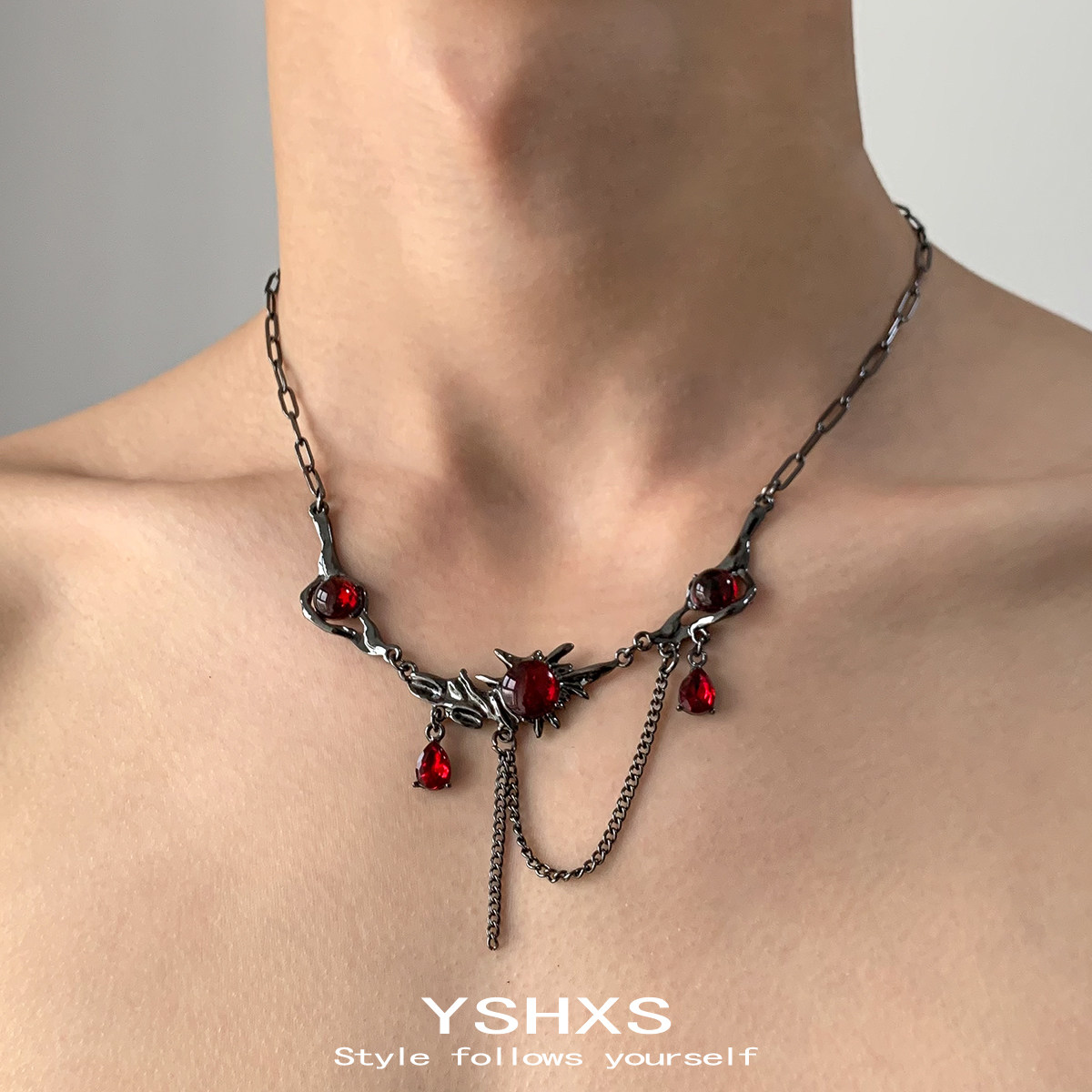 暗黑哥特风红色水钻流苏项链女小众设计感锁骨链亚比配饰
