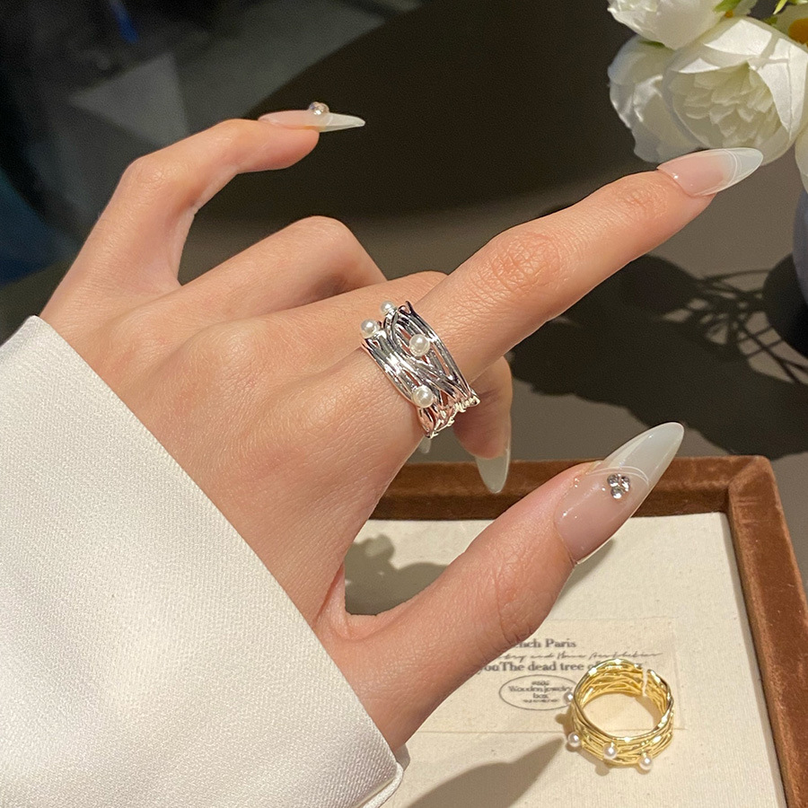 包邮多层线条缠绕戒指女轻奢仿珍珠点缀气质开口指环ins风小众食