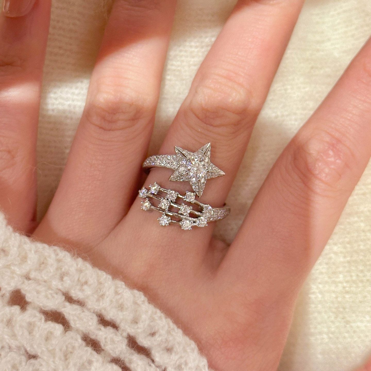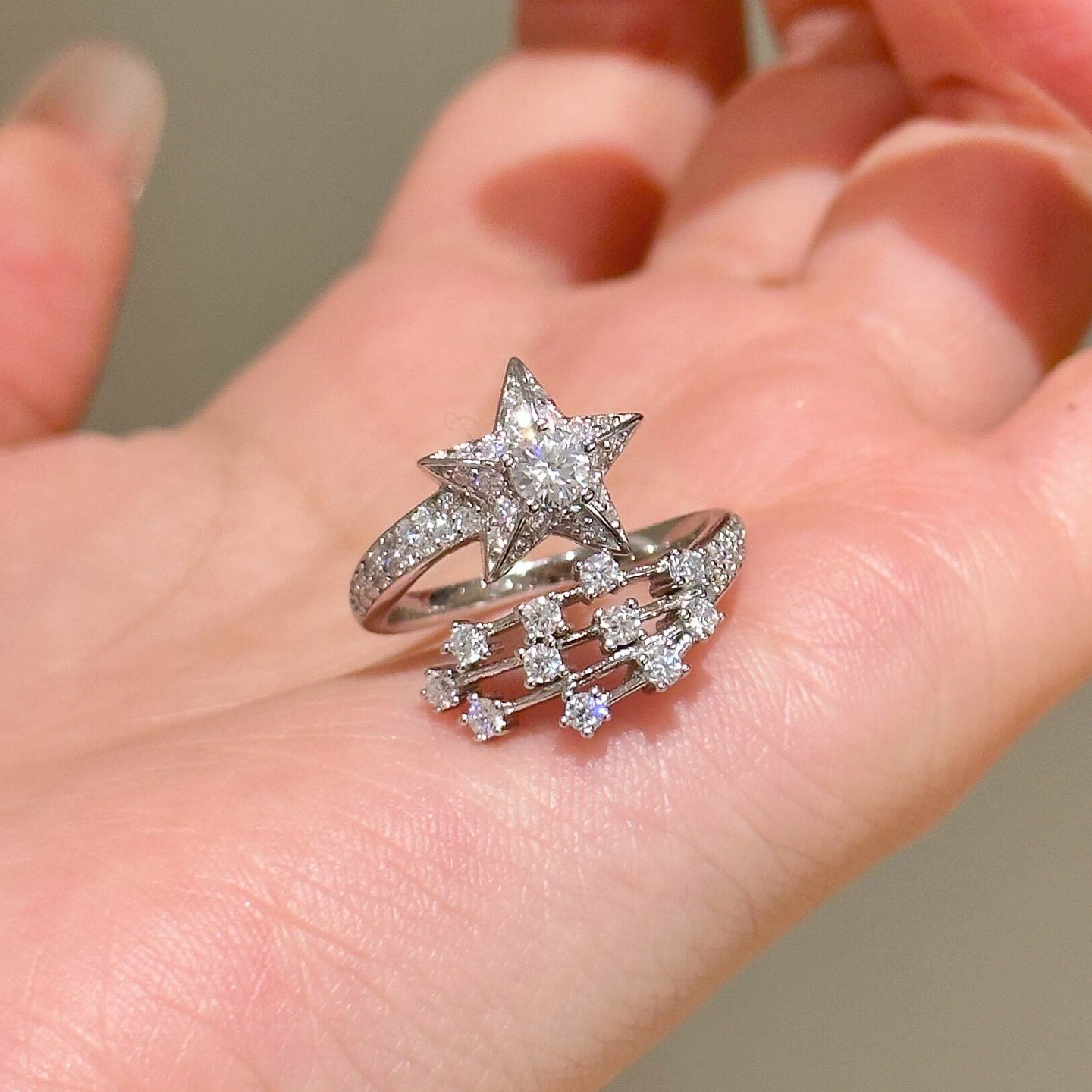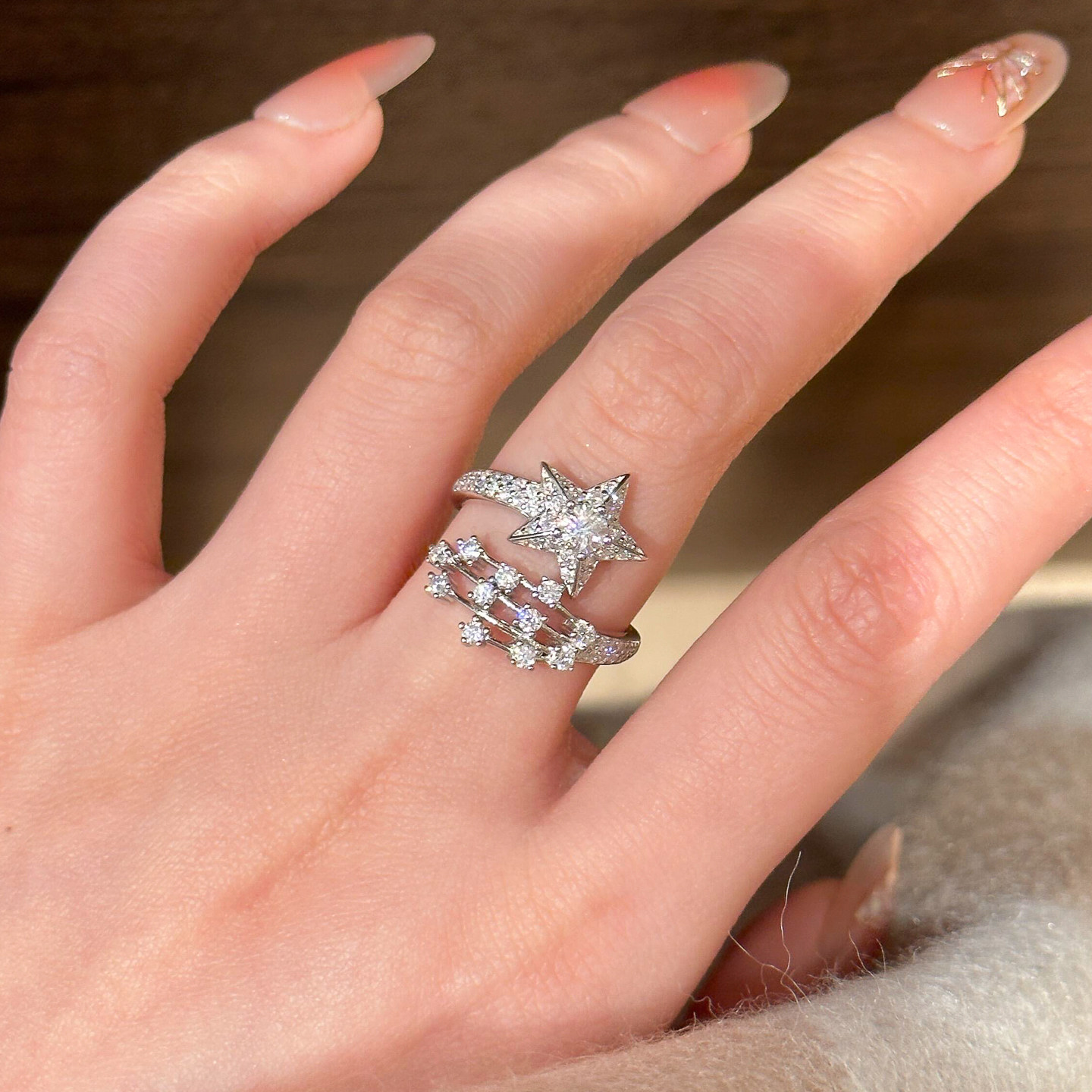 S925银爆闪满钻星星戒指女轻奢高级感小众设计时尚百搭可调节指环