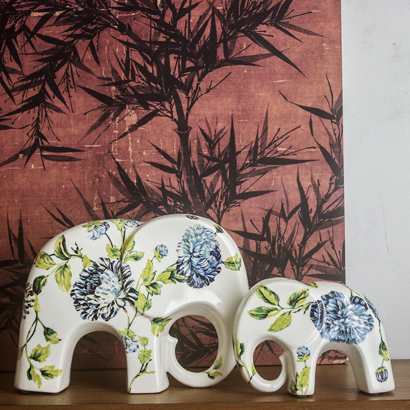 甘棠景德镇陶瓷工艺品法式田园风客厅装饰蓝色花朵纹大象一对摆件