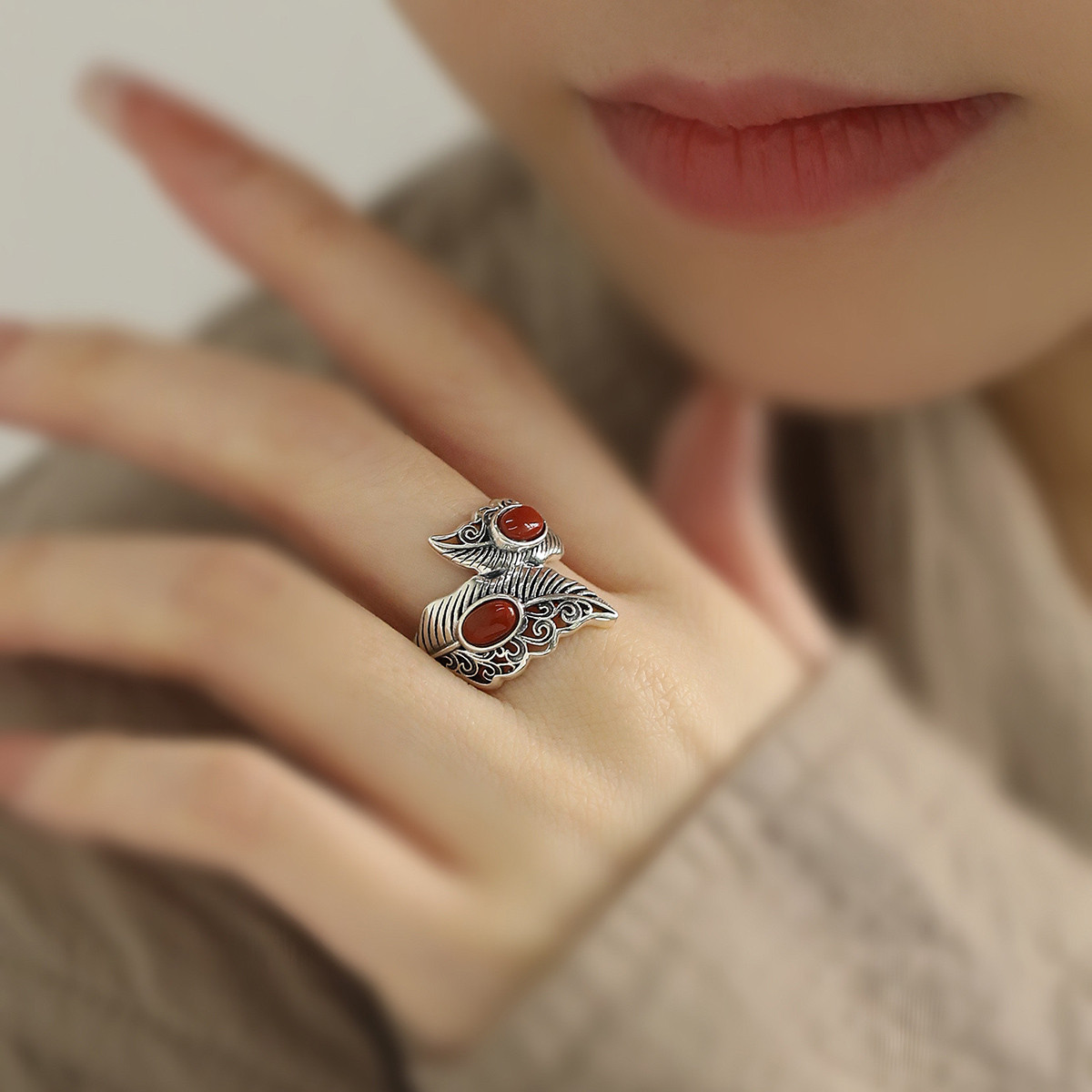 925纯银南红玛瑙树叶戒指2024年指环食指高级感简约尾戒小指装饰