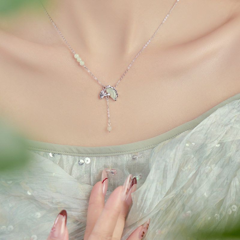 原创新中式s925纯银春色折扇项链女新款轻奢小众设计毛衣链批发