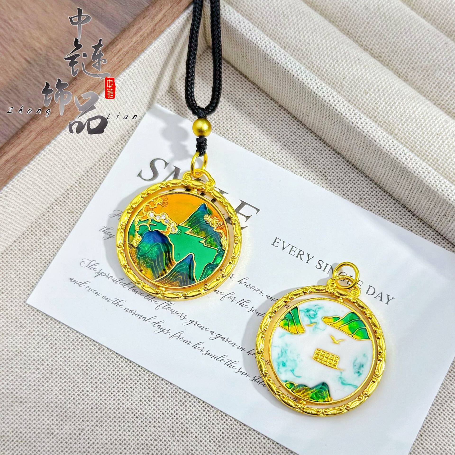 周古法生大福金店同款沙金镶嵌旋转千里江山罗盘吊坠 国潮风珐琅