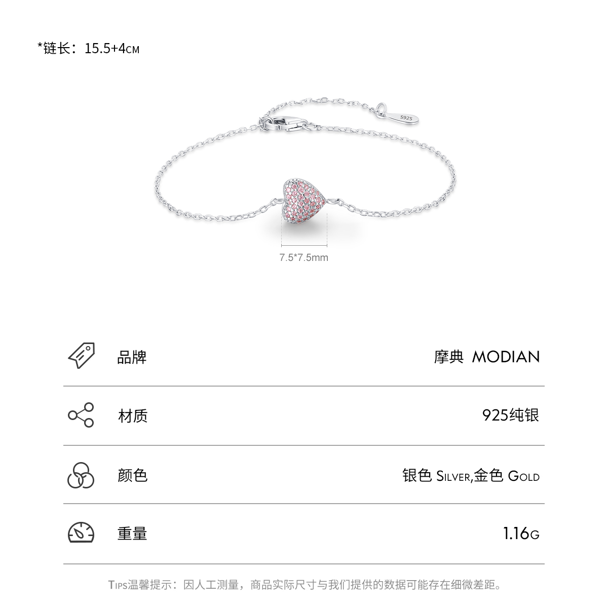 MODIAN摩典S925纯银个性小众心形爱心满钻手链夏季流行手饰送礼物