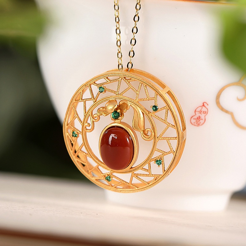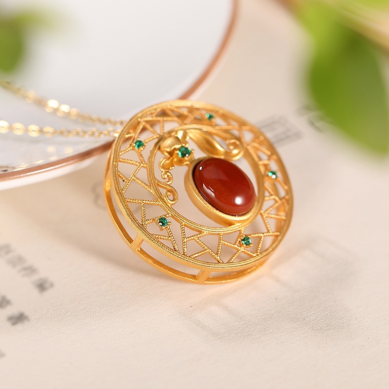 锦河畔 s925纯银镀金南红玛瑙吊坠个性复古镂空花纹女士项链挂坠