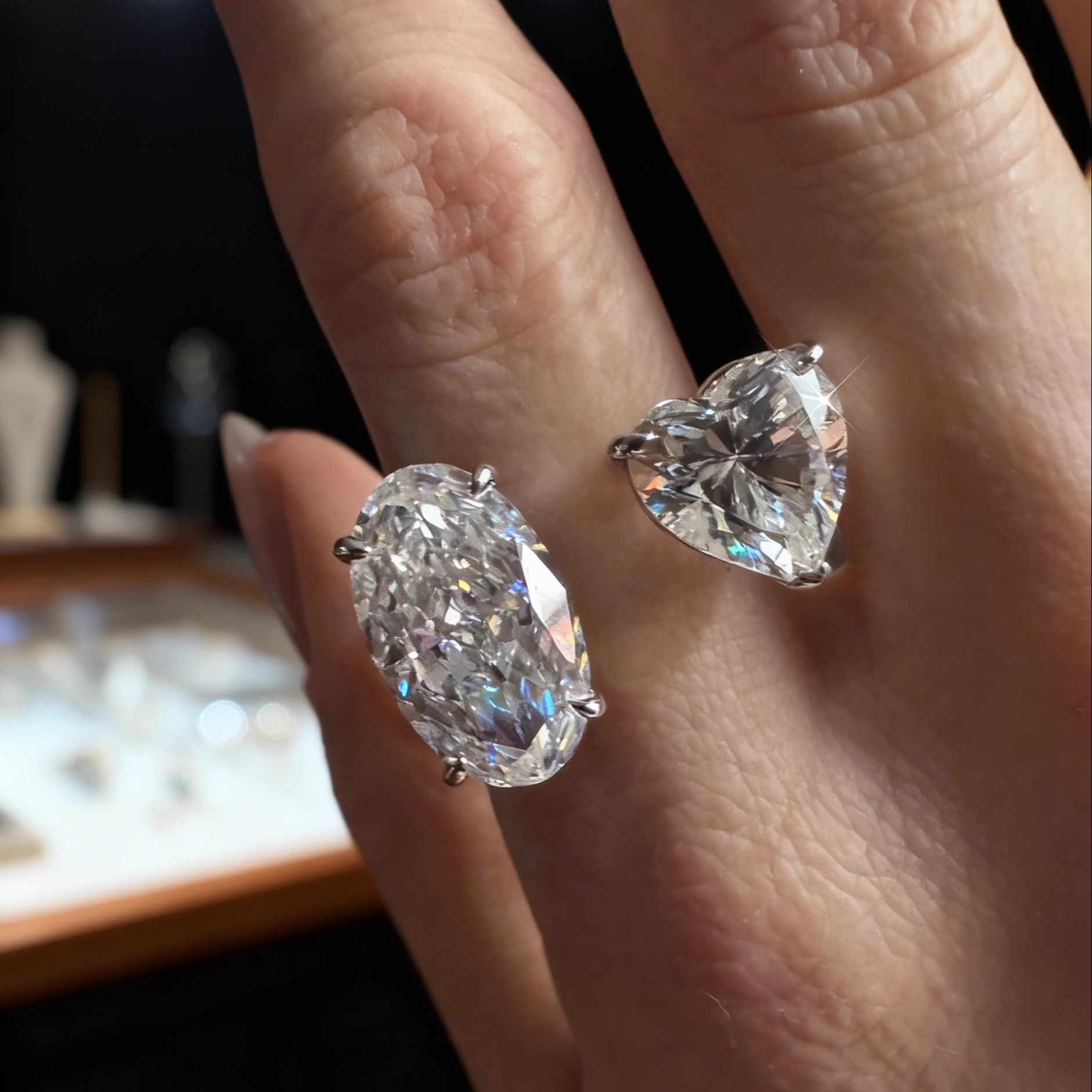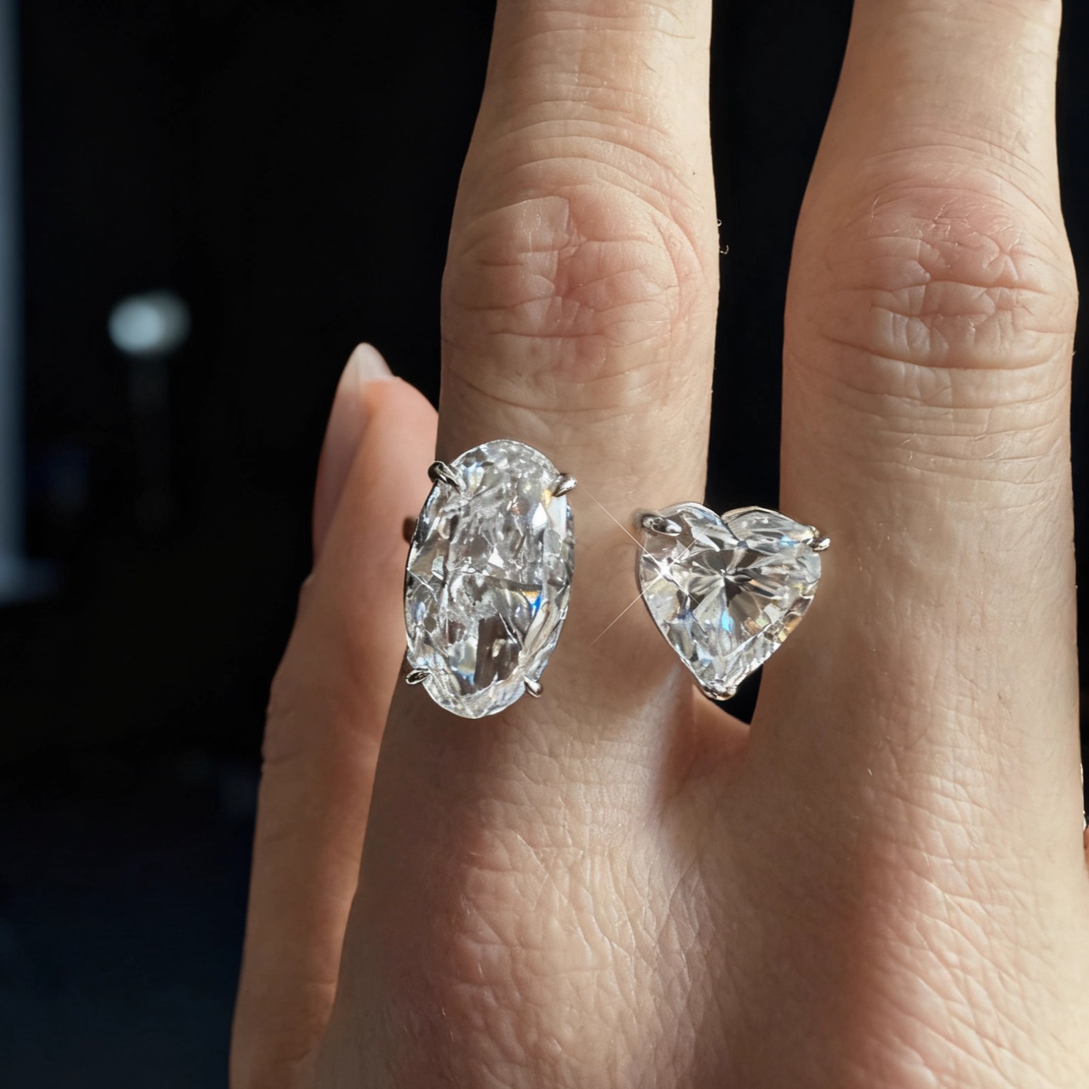 S925银厚戒臂开口戒 椭圆碎冰与心形双石 可调节指环 G色自然白