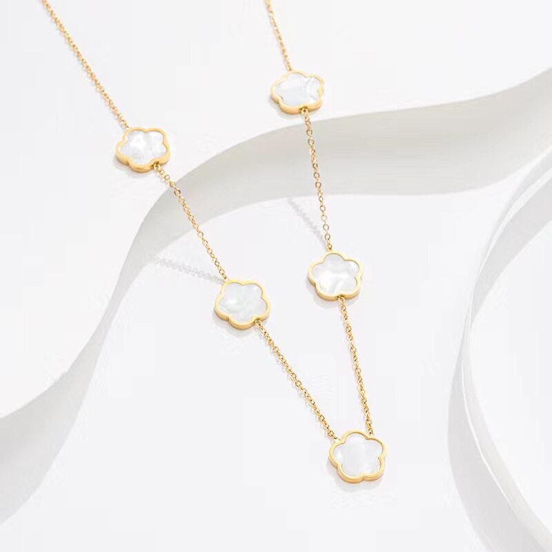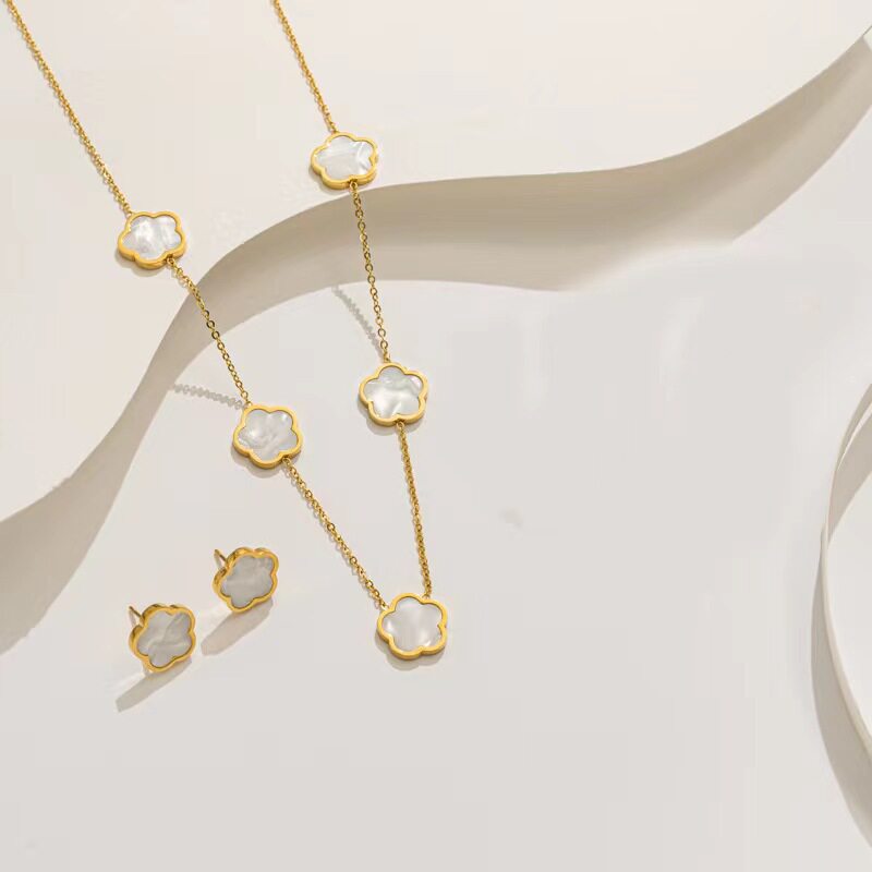 欧拉拉轻奢五叶草项链套装女金色链条白色吊坠百搭气质颈链耳环