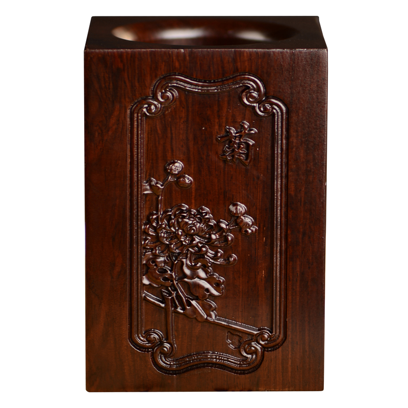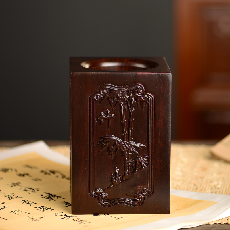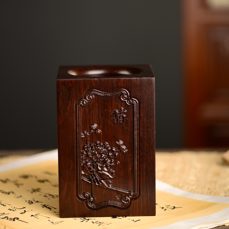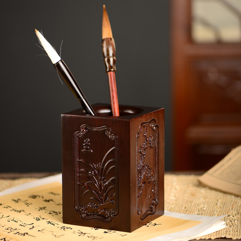 黑檀木雕梅兰竹菊k笔筒工艺品办公室书桌家居客厅木质笔筒摆件送