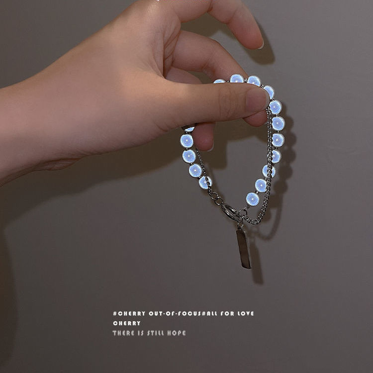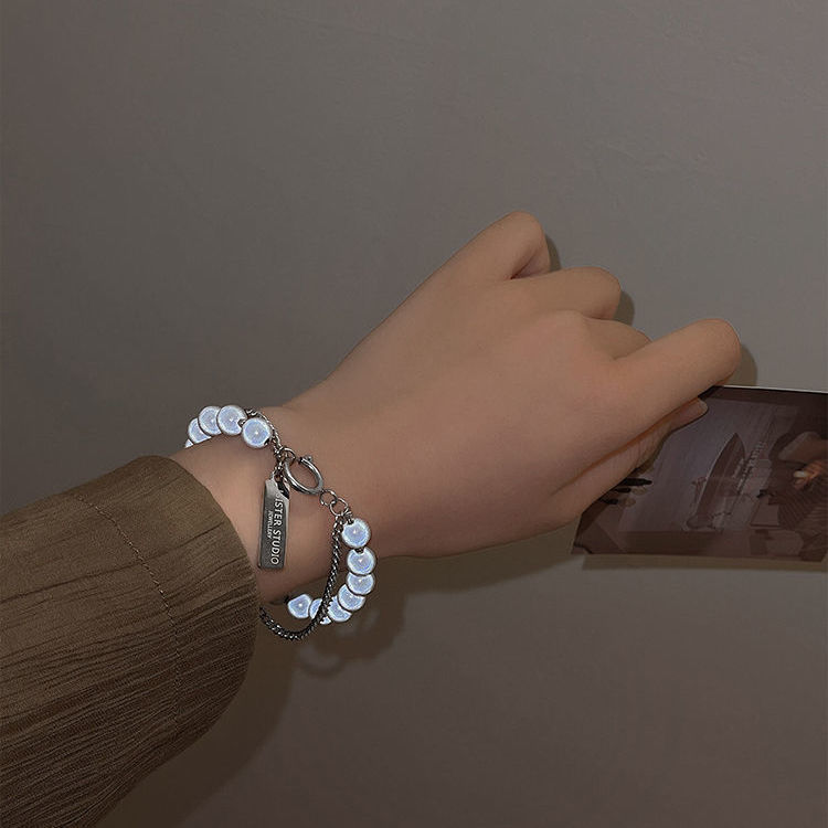 韩版简约小众双层叠戴设计感字母方牌珠光反光珍珠双层手链女手饰