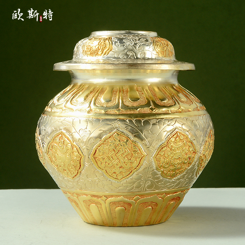 欧斯特 尼泊尔手工 铜鎏金鎏银 财神宝瓶八吉祥家居用品宝瓶摆件