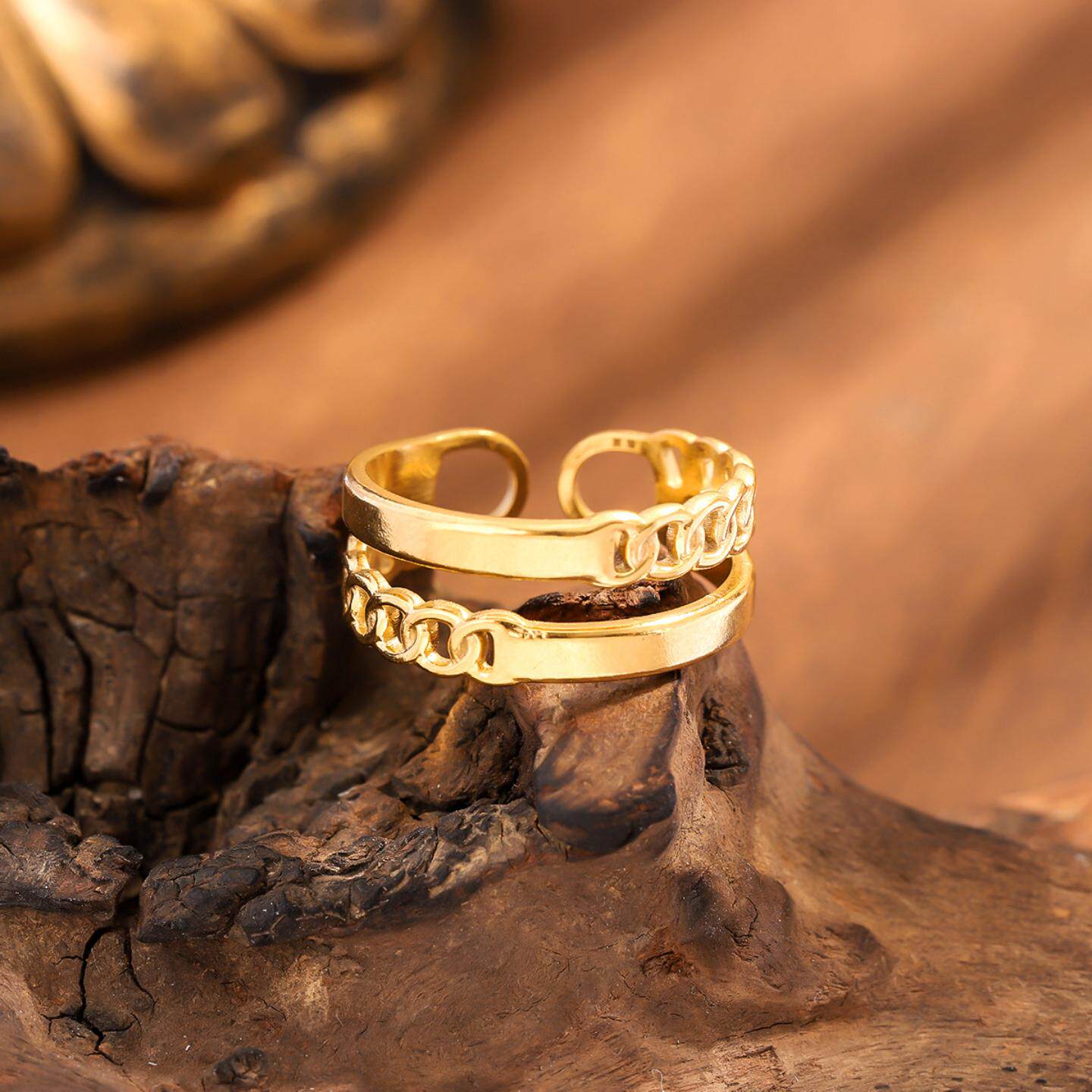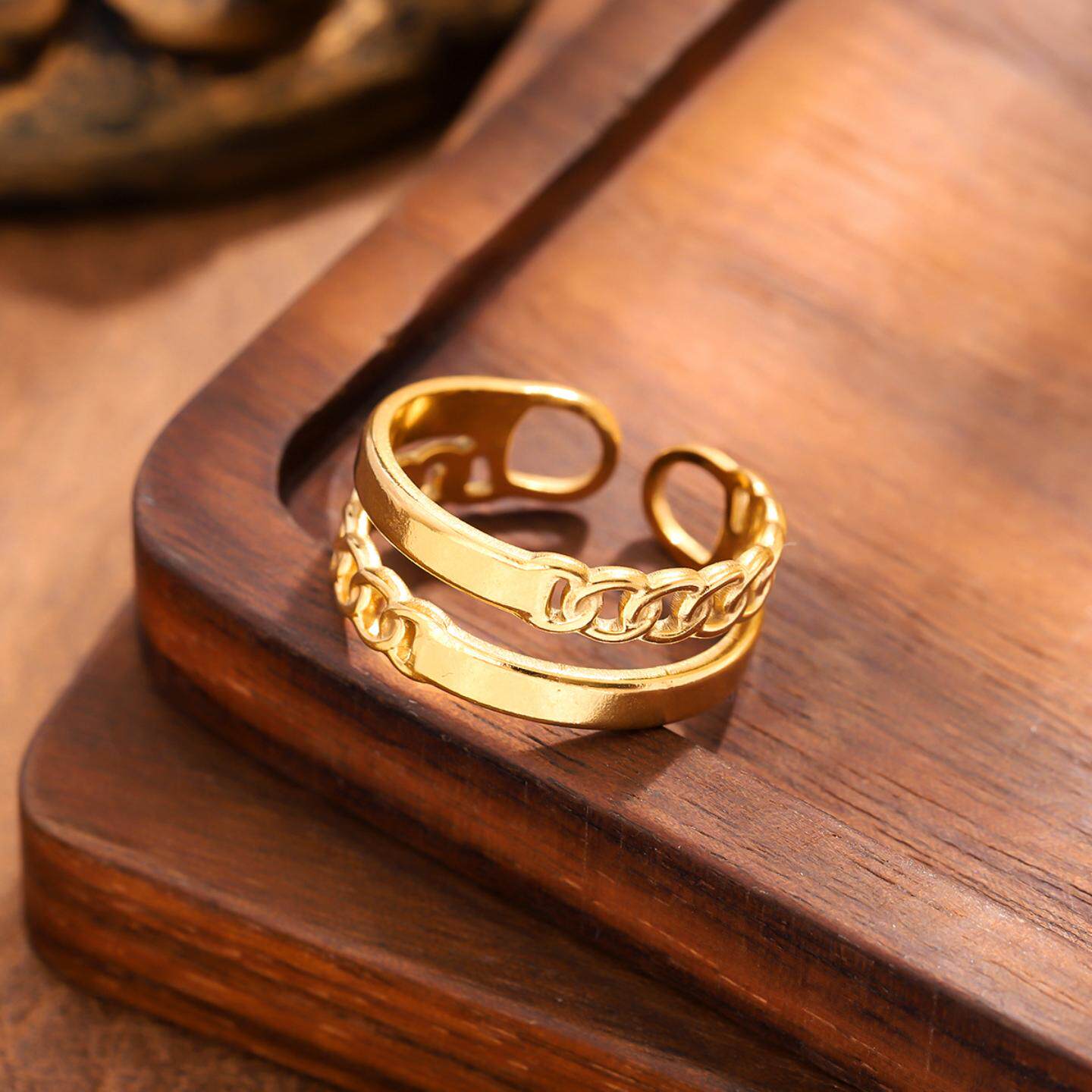 欧美时尚气质百搭双层钛钢链条戒指 18K镀金开口调节指环百搭首饰