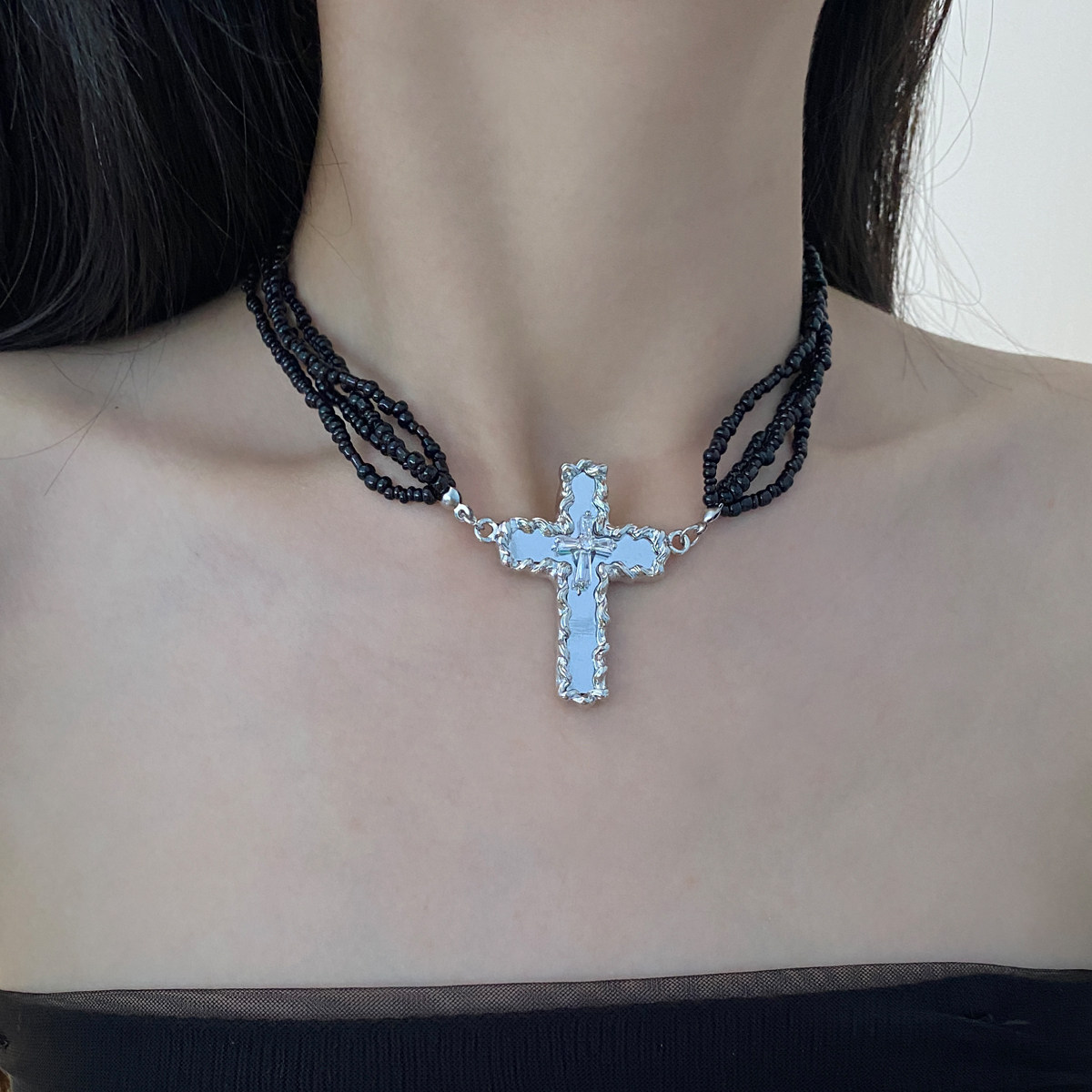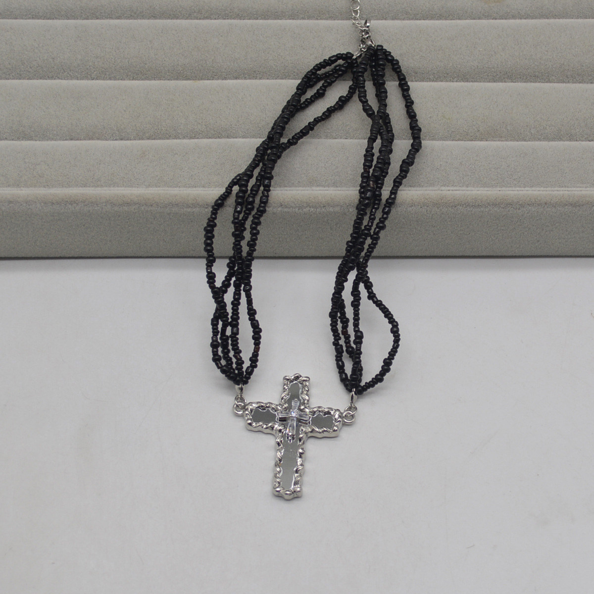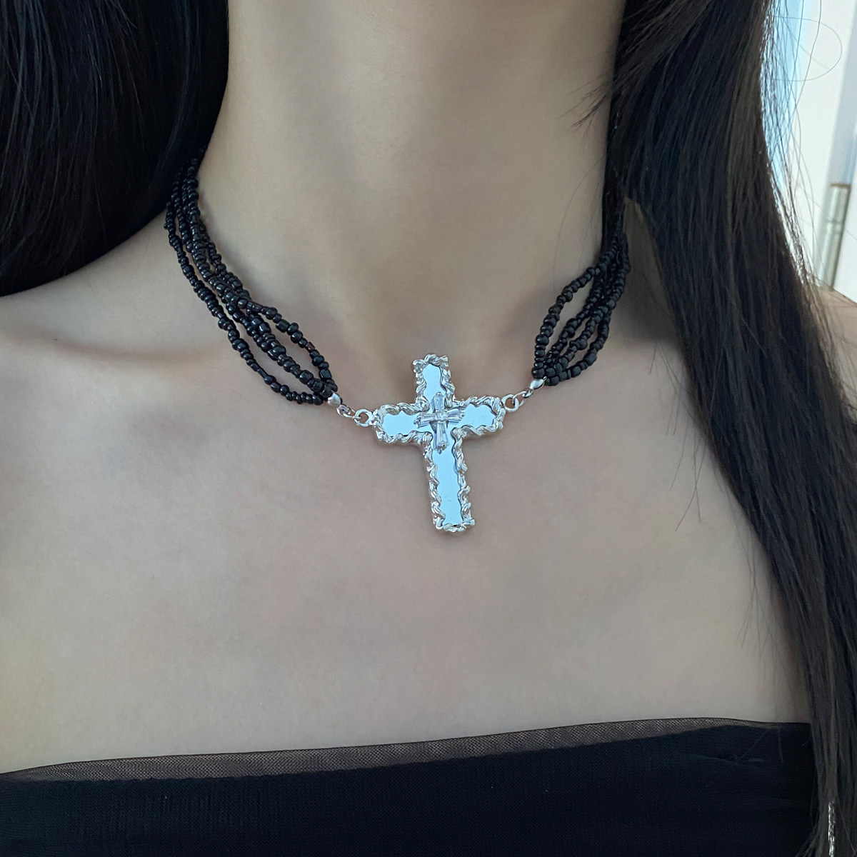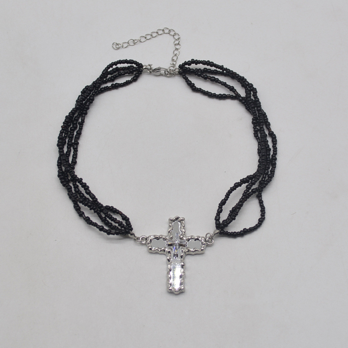 黑色串珠多层镶钻十字架叠戴项链女小众choker锁骨链高级感配饰
